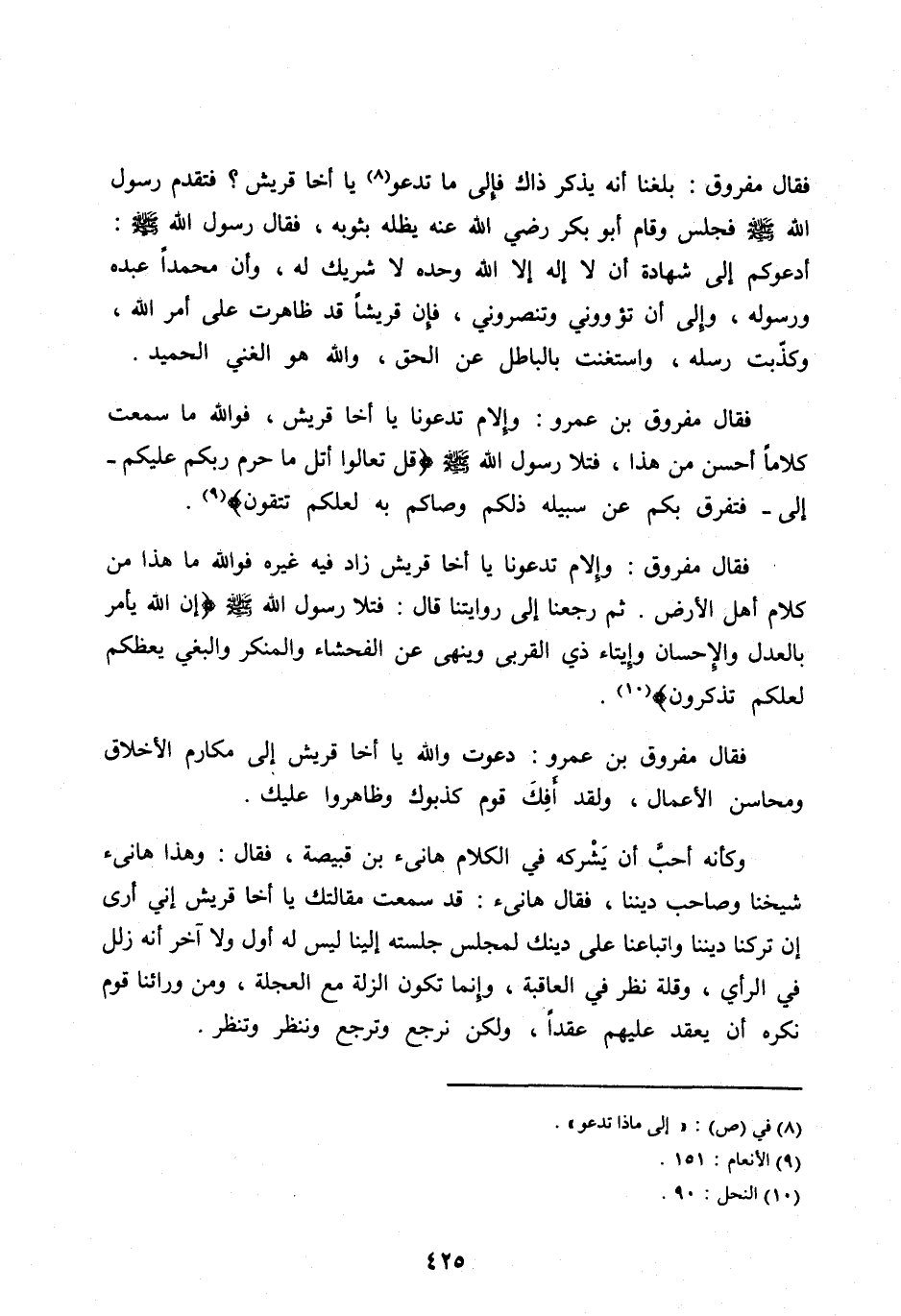 فَقَالَ مَفْرُوقُ بْنُ عَمْرٍو: وَإِلَامَ تَدْعُونَا يا أخا قريش، فو الله مَا سَمِعْتُ كَلَامًا أَحْسَنُ مِنْ هَذَا، فَتَلَا رَسُولُ الله صلى الله عليه وآله وَسَلَّمَ قُلْ تَعالَوْا أَتْلُ مَا حَرَّمَ رَبُّكُمْ عَلَيْكُمْ- إِلَى- فَتَفَرَّقَ بِكُمْ عَنْ سَبِيلِهِ ذلِكُمْ وَصَّاكُمْ بِهِ لَعَلَّكُمْ تَتَّقُونَ [ (9) ] .