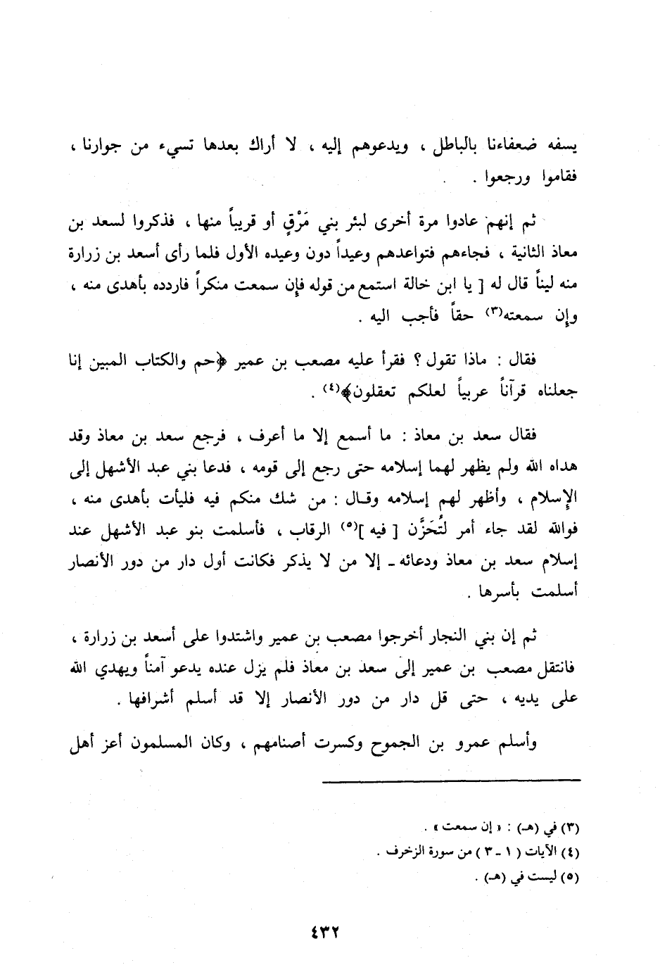 فَقَالَ سَعْدُ بْنُ مُعَاذٍ: مَا أَسْمَعُ إِلَّا مَا أَعْرِفُ، فَرَجَعَ سَعْدُ بْنُ مُعَاذٍ وَقَدْ هَدَاهُ اللهُ وَلَمْ يُظْهِرْ لَهُمَا إِسْلَامَهُ حَتَّى رَجَعَ إِلَى قَوْمِهِ، فَدَعَا بَنِي عَبْدِ الْأَشْهَلِ إِلَى الْإِسْلَامِ، وَأَظْهَرَ لَهُمْ إِسْلَامَهُ وَقَالَ: مَنْ شَكَّ مِنْكُمْ فِيهِ فَلْيَأْتِ بِأَهْدَى مِنْهُ، فو الله لَقَدْ جَاءَ أَمْرٌ لَتُحَزَّنَّ [فِيهِ] [ (5) ] الرِّقَابُ، فَأَسْلَمَتْ بَنُو عَبْدِ الْأَشْهَلِ عِنْدَ إِسْلَامِ سَعْدِ بْنِ مُعَاذٍ وَدُعَائِهِ- إِلَّا مَنْ لَا يُذْكَرُ فَكَانَتْ أَوَّلُ دَارٍ مِنْ دُورِ الْأَنْصَارِ أَسْلَمَتْ بِأَسْرِهَا.