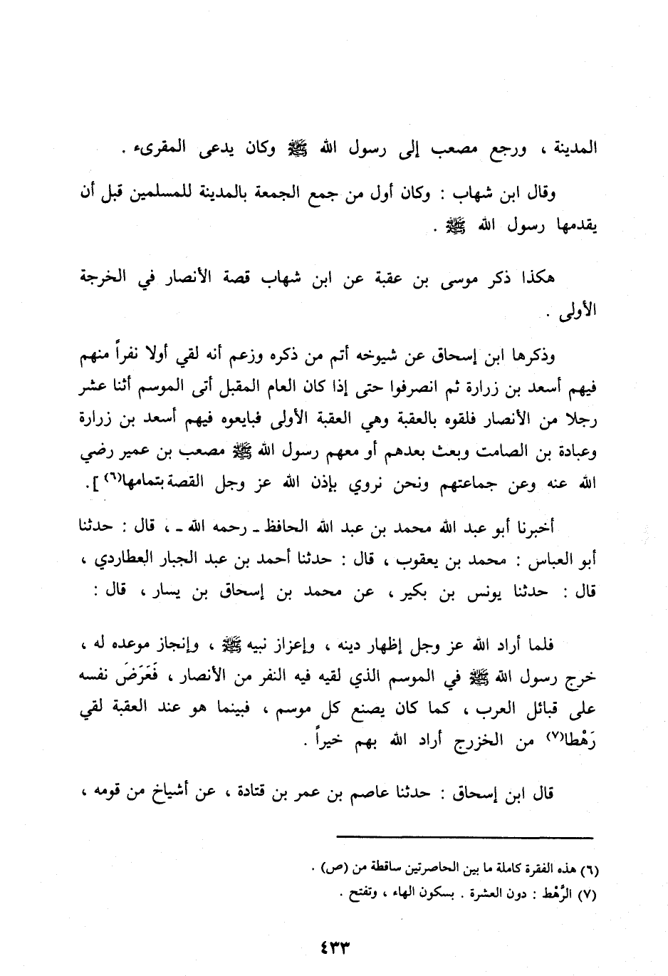 وَذَكَرَهَا ابْنُ إِسْحَاقَ عَنْ شُيُوخِهِ أَتَمَّ مِنْ ذِكْرِهِ وَزَعَمَ أَنَّهُ لَقِيَ أَوَّلًا نَفَرًا مِنْهُمْ فِيهِمْ أَسْعَدُ بْنُ زُرَارَةَ ثُمَّ انْصَرَفُوا حَتَّى إِذَا كَانَ الْعَامُ الْمُقْبِلُ أَتَى الْمَوْسِمَ اثْنَا عَشَرَ رَجُلًا مِنَ الْأَنْصَارِ فَلَقَوْهُ بِالْعَقَبَةِ وَهِيَ الْعَقَبَةُ الْأُولَى فَبَايَعُوهُ فِيهِمْ أَسْعَدُ بْنُ زُرَارَةَ وَعُبَادَةُ بْنُ الصَّامِتِ وَبَعَثَ بَعْدَهُمْ أَوْ مَعَهُمْ رَسُولُ اللهِ صَلَّى اللهُ عليه وآله وسلم مصعب بن عمير رَضِيَ اللهُ عَنْهُ وَعَنْ جَمَاعَتِهِمْ وَنَحْنُ نَرْوِي بِإِذْنِ اللهِ عَزَّ وَجَلَّ الْقِصَّةَ بِتَمَامِهَا [ (6) ]] .