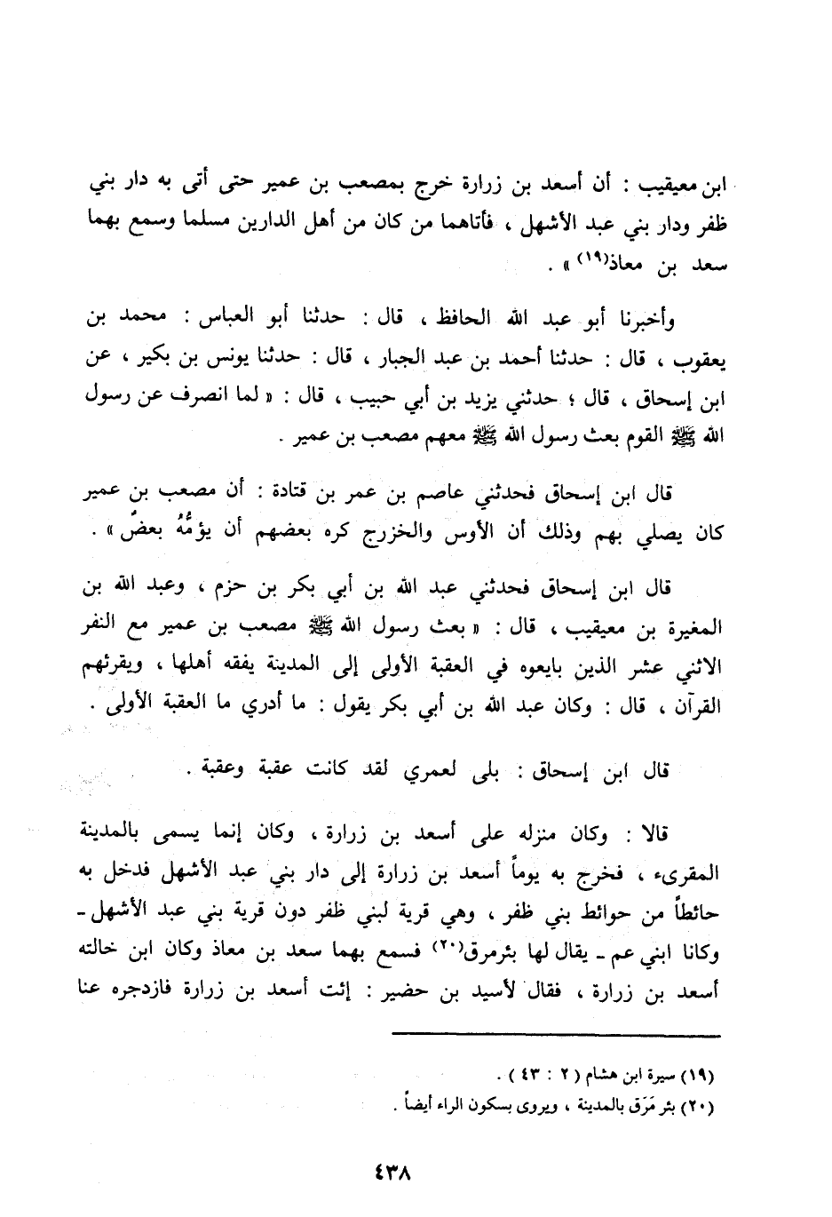 ابن مُعَيْقِيبٍ: أَنَّ أَسْعَدَ بْنَ زُرَارَةَ خَرَجَ بِمُصْعَبِ بْنِ عُمَيْرٍ حَتَّى أَتَى بِهِ دَارَ بَنِي ظَفَرٍ وَدَارَ بَنِي عَبْدِ الْأَشْهَلِ، فَأَتَاهُمَا مَنْ كَانَ مِنْ أَهْلِ الدَّارَيْنِ مُسْلِمًا وَسَمِعَ بِهِمَا سَعْدُ بْنُ مُعَاذٍ [ (19) ] » .