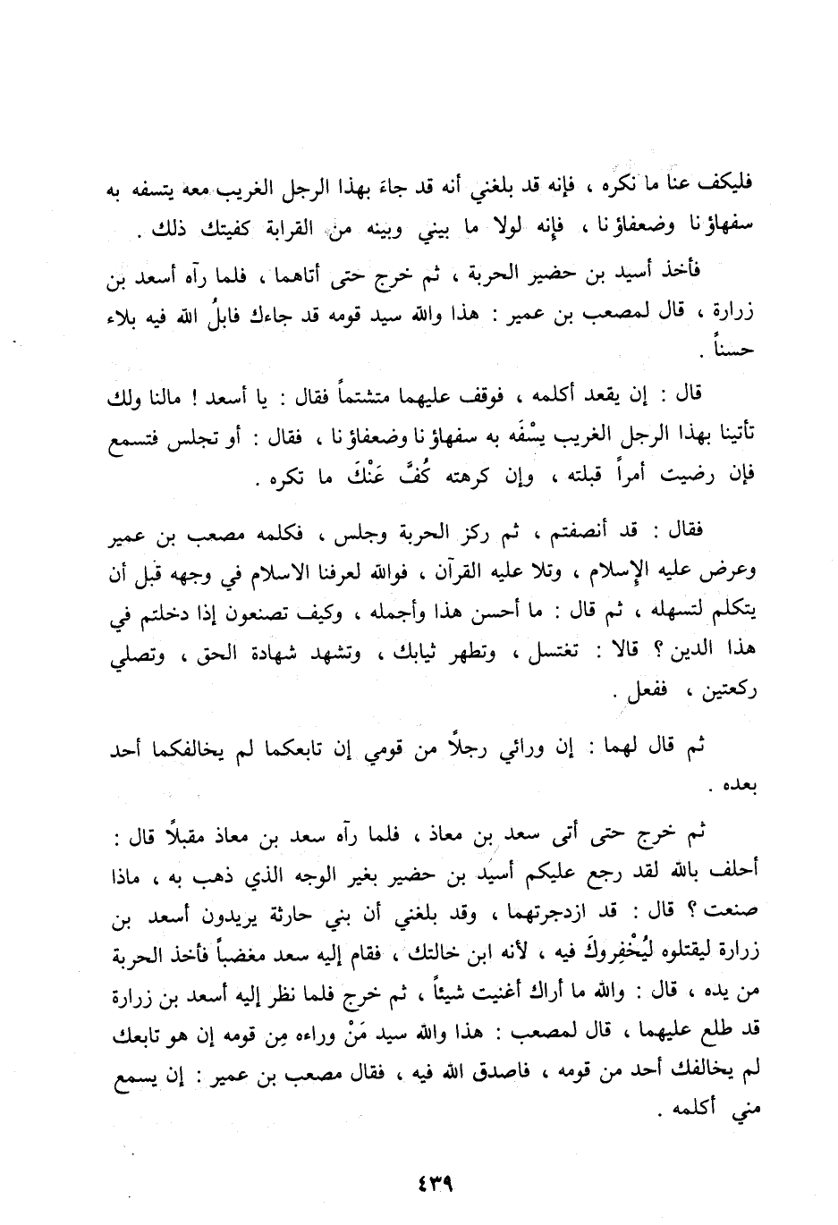 أَحْلِفُ بِاللهِ لَقَدْ رَجَعَ عَلَيْكُمْ أُسَيْدُ بْنُ حُضَيْرٍ بِغَيْرِ الْوَجْهِ الَّذِي ذَهَبَ بِهِ، مَاذَا صَنَعْتَ؟ قَالَ: قَدِ ازْدَجَرْتُهُمَا، وَقَدْ بَلَغَنِي أَنَّ بَنِي حَارِثَةَ يُرِيدُونَ أَسْعَدَ بْنَ زُرَارَةَ لِيَقْتُلُوهُ لِيُخْفِرُوكَ فِيهِ، لِأَنَّهُ ابْنُ خَالَتِكَ، فَقَامَ إِلَيْهِ سَعْدٌ مُغْضَبًا فَأَخَذَ الْحَرْبَةَ مِنْ يَدَهِ، قَالَ: وَاللهِ مَا أَرَاكَ أَغْنَيْتَ شَيْئًا، ثُمَّ خَرَجَ فَلَمَّا نَظَرَ إِلَيْهِ أَسْعَدُ بْنُ زُرَارَةَ قَدْ طَلَعَ عَلَيْهِمَا، قَالَ لِمُصْعَبٍ: هَذَا وَاللهِ سَيِّدُ مَنْ وَرَاءَهُ مِنْ قَوْمِهِ إِنْ هُوَ تَابَعَكَ لَمْ يُخَالِفْكَ أَحَدٌ مِنْ قَوْمِهِ، فَاصْدُقِ اللهَ فِيهِ، فَقَالَ مُصْعَبُ بْنُ عُمَيْرٍ: إِنْ يَسْمَعْ مِنِّي أُكَلِّمْهُ.