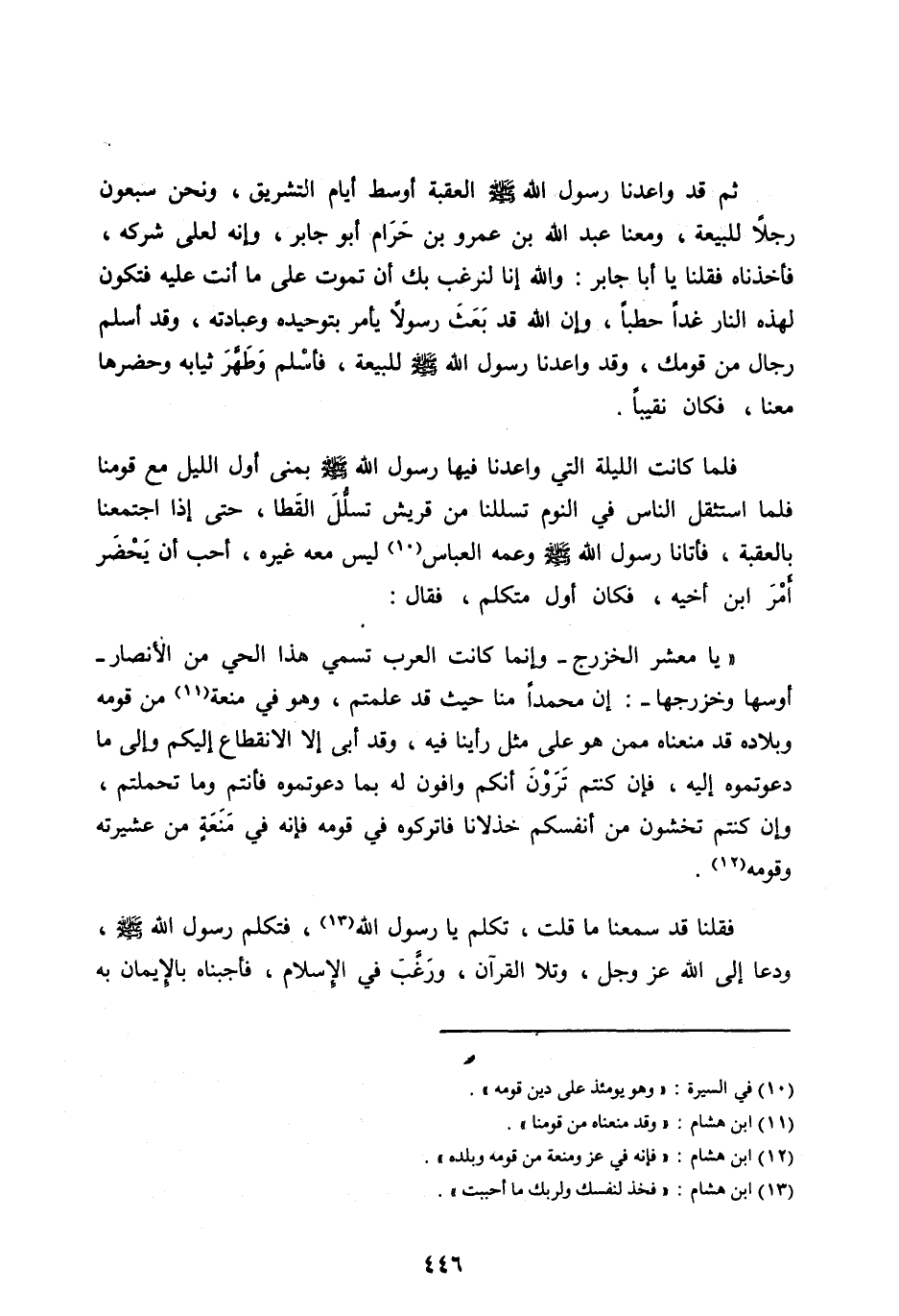 ثُمَّ قَدْ وَاعَدَنَا رَسُولُ اللهِ صَلَّى اللهُ عليه وآله وَسَلَّمَ الْعَقَبَةَ أَوْسَطَ أَيَّامِ التَّشْرِيقِ، وَنَحْنُ سَبْعُونَ رَجُلًا لِلْبَيْعَةِ، وَمَعَنَا عَبْدُ اللهِ بْنُ عَمْرِو بْنِ حَرَامٍ أَبُو جَابِرٍ، وَإِنَّهُ لَعَلَى شَرْكِهِ، فَأَخَذْنَاهُ فَقُلْنَا يَا أَبَا جَابِرٍ: وَاللهِ إِنَّا لَنَرْغَبُ بِكَ أَنْ تَمُوتَ عَلَى مَا أَنْتَ عَلَيْهِ فَتَكُونَ لِهَذِهِ النَّارِ غَدًا حَطَبًا، وَإِنَّ اللهَ قَدْ بَعَثَ رَسُولًا يَأْمُرُ بِتَوحِيدِهِ وَعِبَادَتِهِ، وَقَدْ أَسْلَمَ رِجَالٌ مِنْ قَوْمِكَ، وقَدْ وَاعَدَنَا رَسُولُ اللهِ صَلَّى اللهُ عَلَيْهِ وآله وَسَلَّمَ لِلْبَيْعَةِ، فَأَسْلَمَ وَطَهَّرَ ثِيَابَهُ وَحَضَرَهَا مَعَنَا، فَكَانَ نَقِيبًا.