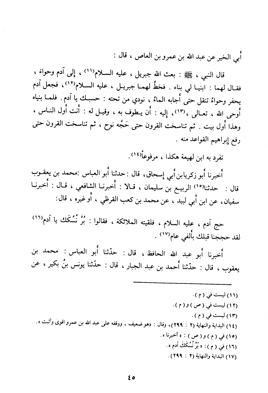 قَالَ النَّبِيُّ، صَلَّى اللهُ عليه وآله وَسَلَّمَ: بَعَثَ اللهُ جِبْرِيلَ، عَلَيْهِ السَّلَامُ [ (11) ] ، إِلَى آدَمَ وَحَوَّاءَ، فَقَالَ لَهُمَا: ابْنِيَا لِي بِنَاءً. فَخَطَّ لَهُمَا جِبْرِيلُ، عَلَيْهِ السَّلَامُ [ (12) ] ، فَجَعَلَ آدَمُ يَحْفِرُ وَحَوَّاءُ تَنْقِلُ حَتَّى أَجَابَهُ الْمَاءُ، نُودِيَ مِنْ تَحْتِهِ: حَسْبُكَ يَا آدَمُ. فَلَمَّا بَنَيَاهُ أَوْحَى اللهُ، تَعَالَى، [ (13) ] ، إِلَيْهِ: أَنْ يَطُوفَ بِهِ، وَقِيلَ لَهُ: أَنْتَ أَوَّلُ النَّاسِ، وَهَذَا أَوَّلُ بَيْتٍ. ثُمَّ تَنَاسَخَتِ الْقُرُونُ حَتَّى حَجَّهُ نُوحٌ، ثُمَّ تَنَاسَخَتِ الْقُرُونُ حَتَّى رَفَعَ إِبْرَاهِيمُ الْقَوَاعِدَ مِنْهُ.