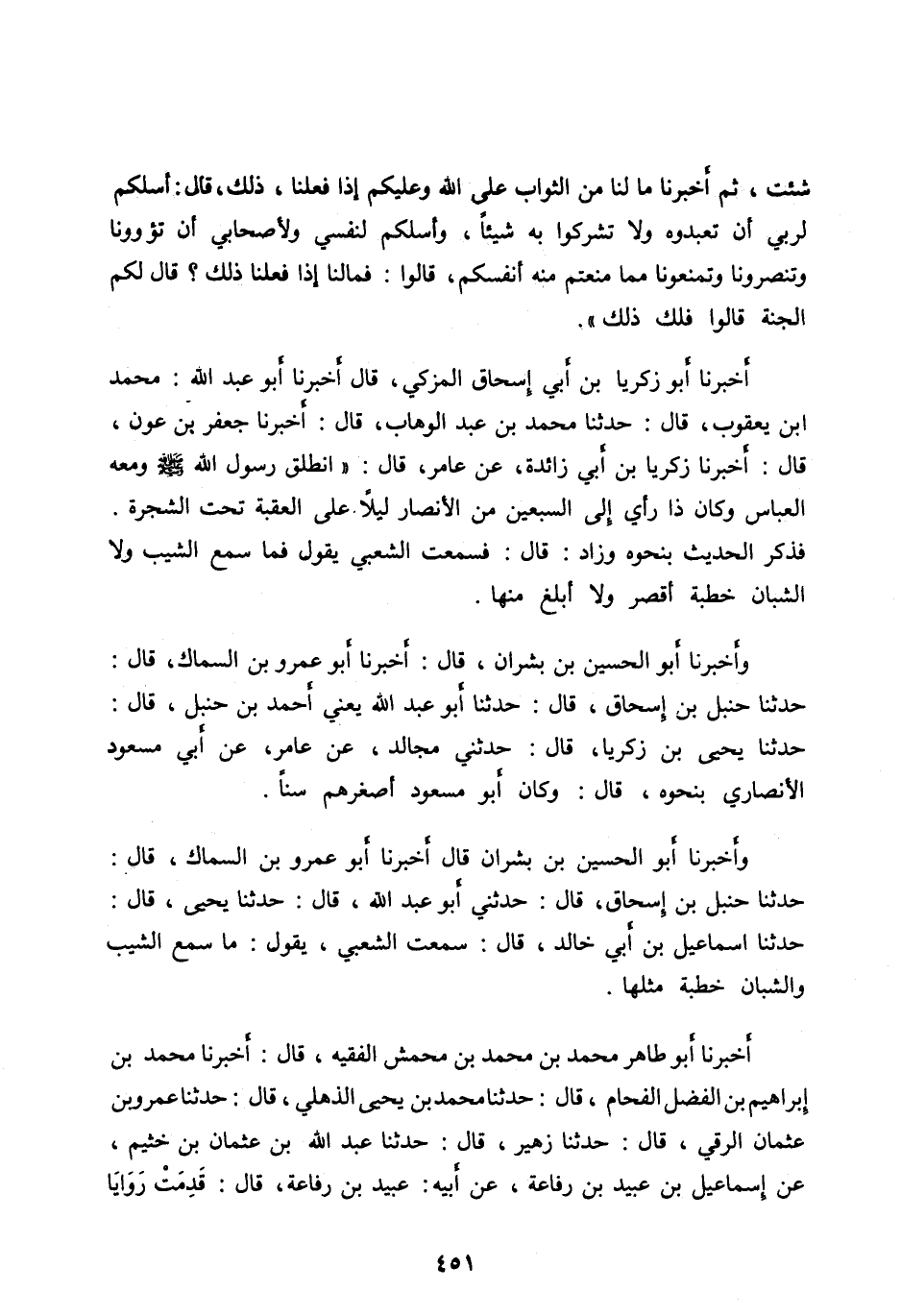 أَخْبَرَنَا أَبُو زَكَرِيَّا بْنُ أَبِي إِسْحَاقَ الْمُزَكِّي، قَالَ أَخْبَرَنَا أَبُو عَبْدِ اللهِ: محمد ابن يَعْقُوبَ، قَالَ: حَدَّثَنَا مُحَمَّدُ بْنُ عَبْدِ الْوَهَّابِ، قَالَ: أَخْبَرَنَا جَعْفَرُ بْنُ عَوْنٍ، قَالَ: أَخْبَرَنَا زَكَرِيَّا بْنُ أَبِي زَائِدَةَ، عَنْ عَامِرٍ، قَالَ: «انْطَلَقَ رَسُولُ اللهِ صلى الله عليه وآله وَسَلَّمَ وَمَعَهُ الْعَبَّاسُ وَكَانَ ذَا رَأْيٍ إِلَى السَّبْعِينَ مِنَ الْأَنْصَارِ لَيْلًا عَلَى الْعَقَبَةِ تَحْتَ الشَّجَرَةِ.