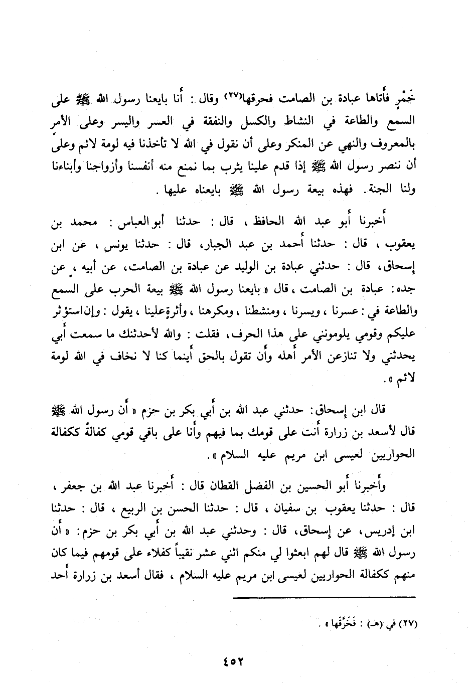 وأَخْبَرَنَا أَبُو الْحُسَيْنِ بْنُ الْفَضْلِ الْقَطَّانُ قَالَ: أَخْبَرَنَا عَبْدُ اللهِ بْنُ جَعْفَرٍ، قَالَ: حَدَّثَنَا يَعْقُوبُ بْنُ سُفْيَانَ، قَالَ: حَدَّثَنَا الْحَسَنُ بْنُ الرَّبِيعِ، قَالَ: حَدَّثَنَا ابْنُ إِدْرِيسَ، عن إِسْحَاقَ، قَالَ: وحَدَّثَنِي عَبْدُ اللهِ بْنُ أَبِي بَكْرِ بْنِ حَزْمٍ: «أَنَّ رَسُولَ اللهِ صَلَّى اللهُ عَلَيْهِ وآله وَسَلَّمَ قَالَ لَهُمُ ابْعَثُوا لِي مِنْكُمُ اثْنَيْ عَشَرَ نَقِيبًا كُفَلَاءَ عَلَى قَوْمِهِمْ فِيمَا كَانَ مِنْهُمْ كَكَفَالَةِ الحواريين لعيسى بن مَرْيَمَ عَلَيْهِ السَّلَامُ، فَقَالَ أَسْعَدُ بْنُ زُرَارَةَ أَحَدُ