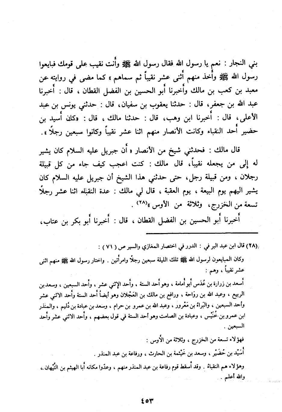 كَمَا مَضَى فِي رِوَايَتِهِ عَنْ مَعْبَدِ بْنِ كَعْبِ بْنِ مَالِكٍ وأَخْبَرَنَا أَبُو الْحُسَيْنِ بْنُ الْفَضْلِ الْقَطَّانُ، قَالَ: أَخْبَرَنَا عَبْدُ اللهِ بْنُ جَعْفَرٍ، قَالَ: حَدَّثَنَا يَعْقُوبُ بْنُ سُفْيَانَ، قَالَ: حَدَّثَنِي يُونُسُ بْنُ عَبْدِ الْأَعْلَى، قَالَ: أَخْبَرَنَا ابْنُ وَهْبٍ، قَالَ: حَدَّثَنَا مَالِكٌ، قَالَ: «كَانَ أُسَيْدُ بْنُ حُضَيْرٍ أَحَدَ النُّقَبَاءِ وَكَانَتِ الْأَنْصَارُ مِنْهُمُ اثْنَا عَشَرَ نَقِيبًا وَكَانُوا سَبْعِينَ رَجُلًا» .