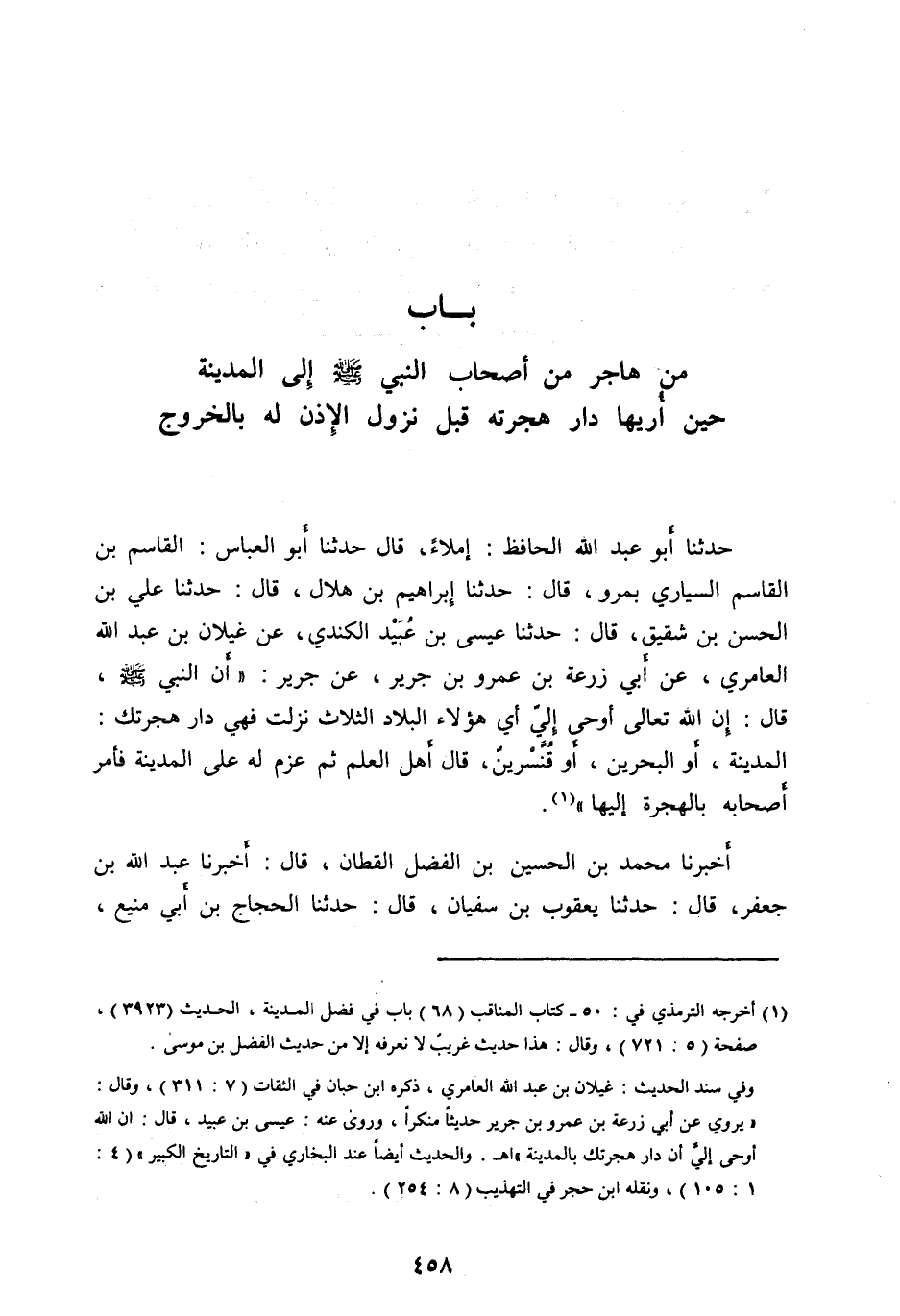حَدَّثَنَا أَبُو عَبْدِ اللهِ الْحَافِظُ: إِمْلَاءً، قَالَ حَدَّثَنَا أَبُو الْعَبَّاسِ: الْقَاسِمُ بْنُ الْقَاسِمِ السَّيَّارِيُّ بِمَرْوَ، قَالَ: حَدَّثَنَا إِبْرَاهِيمُ بْنُ هِلَالٍ، قَالَ: حَدَّثَنَا عَلِيُّ بْنُ الْحَسَنِ بْنِ شَقِيقٍ، قَالَ: حَدَّثَنَا عِيسَى بْنُ عُبَيْدٍ الْكِنْدِيُّ، عَنْ غَيْلَانَ بْنِ عَبْدِ اللهِ الْعَامِرِيِّ، عَنْ أَبِي زُرْعَةَ بْنِ عَمْرِو بْنِ جَرِيرٍ، عَنْ جَرِيرٍ: «أَنَّ النَّبِيَّ صَلَّى اللهُ عليه وآله وَسَلَّمَ، قَالَ: إِنَّ اللهَ تَعَالَى أَوْحَى إِلَيَّ أَيَّ هَؤُلَاءِ الْبِلَادِ الثَّلَاثِ نَزَلْتَ فَهِيَ دَارُ هِجْرَتِكَ:
