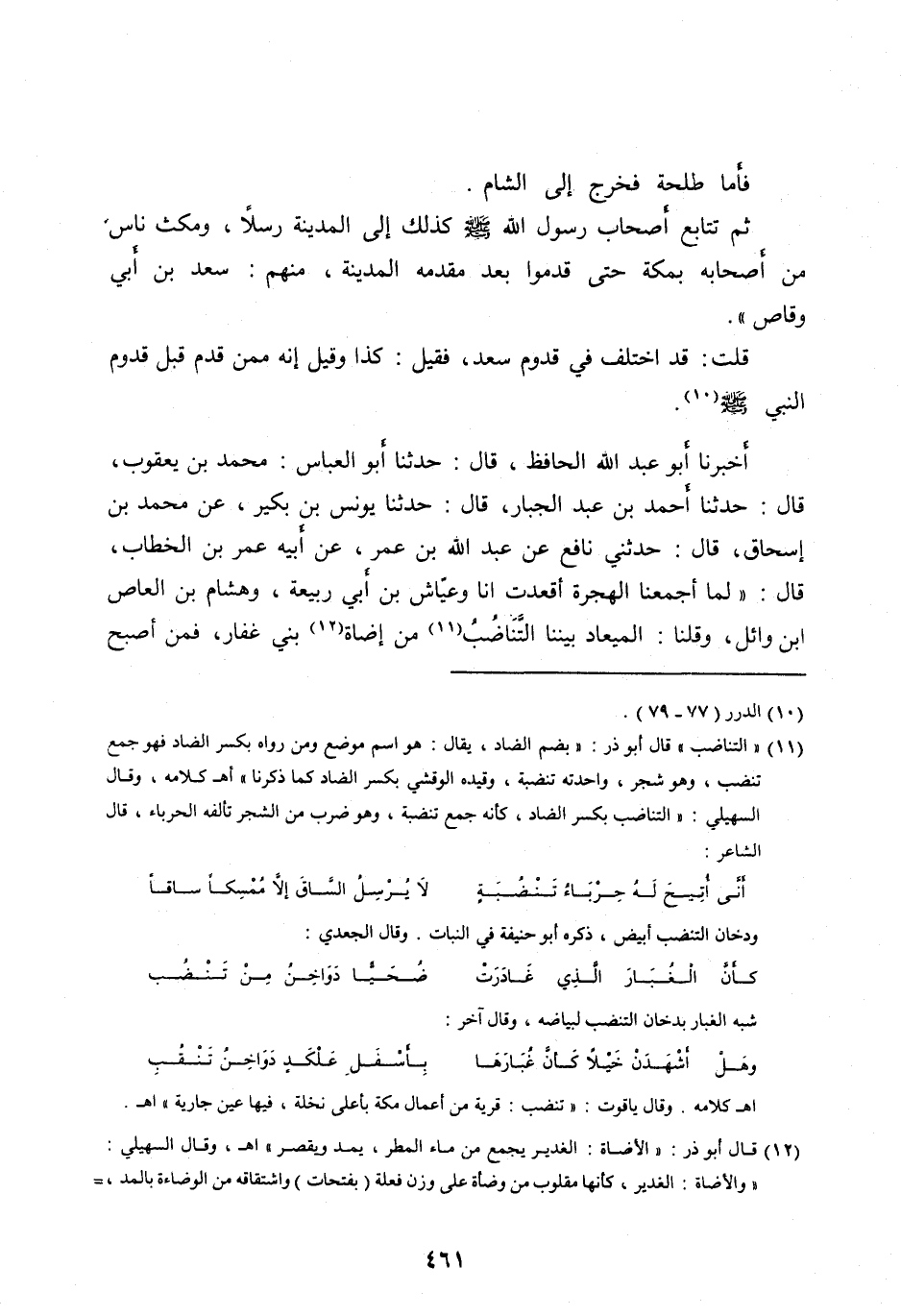 [ (11) ] «التناضب» قال أبو ذر: «بضم الضاد، يقال: هو اسم موضع ومن رواه بكسر الضاد فهو جمع تنضب، وهو شجر، واحدته تنضبة، وقيده الوقشي بكسر الضاد كما ذكرنا» أه كلامه، وقال السهيلي: «التناضب بكسر الضاد، كأنه جمع تنضبة، وهو ضرب من الشجر تألفه الحرباء، قال الشاعر: