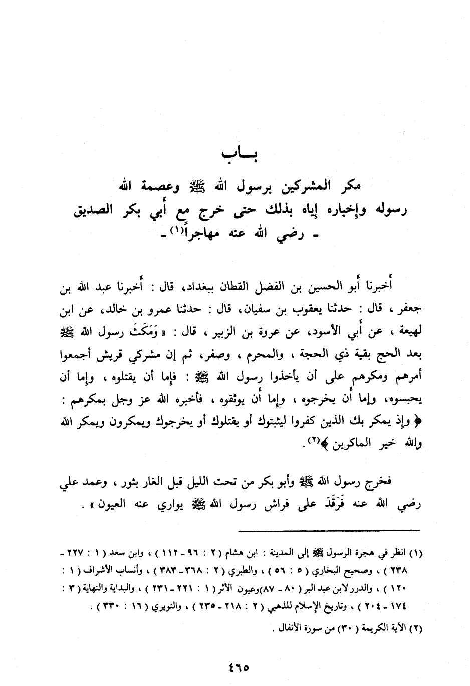 بَابُ مَكَرِ الْمُشْرِكِينَ بِرَسُولِ اللهِ صَلَّى اللهُ عليه وآله وَسَلَّمَ وَعِصْمَةِ اللهِ رَسُولَهُ وَإِخْبَارِهِ إِيَّاهُ بِذَلِكَ حَتَّى خَرَجَ مَعَ أَبِي بَكْرٍ الصِّدِّيقِ- رَضِيَ اللهُ عَنْهُ مُهَاجِرًا [ (1) ]-