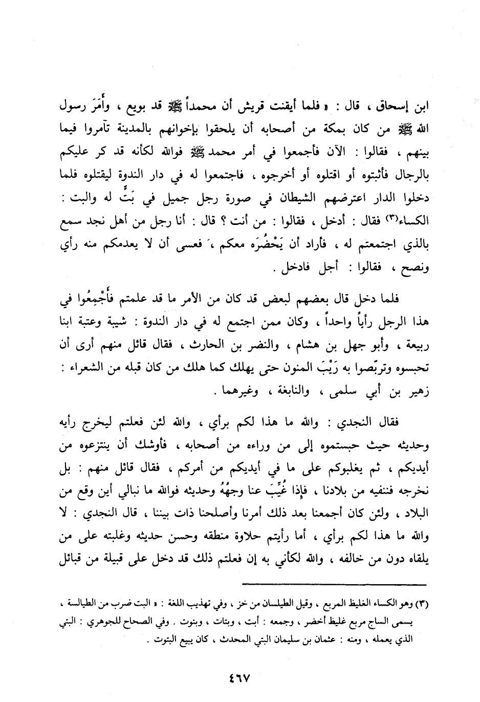 ابْنِ إِسْحَاقَ، قَالَ: «فَلَمَّا أَيْقَنَتْ قُرَيْشٌ أَنَّ مُحَمَّدًا صَلَّى اللهُ عَلَيْهِ وآله وَسَلَّمَ قَدْ بُويِعَ، وَأَمَرَ رَسُولُ اللهِ صَلَّى الله عليه وآله وَسَلَّمَ مَنْ كَانَ بِمَكَّةَ مِنْ أَصْحَابِهِ أَنْ يَلْحَقُوا بِإِخْوَانِهِمْ بِالْمَدِينَةِ تَآمَرُوا فِيمَا بَيْنَهُمْ، فَقَالُوا: الْآنَ فَأَجْمِعُوا فِي أَمْرِ مُحَمَّدٍ صَلَّى اللهُ عَلَيْهِ وآله وسلّم فو الله لَكَأَنَّهُ قَدْ كَرَّ عَلَيْكُمْ بِالرِّجَالِ فَأَثْبِتُوهُ أَوِ اقْتُلُوهُ أَوْ أَخْرِجُوهُ، فَاجْتَمَعُوا لَهُ فِي دَارِ النَّدْوَةِ لِيَقْتُلُوهُ فَلَمَّا دَخَلُوا الدَّارَ اعْتَرَضَهُمُ الشَّيْطَانُ فِي صُورَةِ رَجُلٍ جَمِيلٍ فِي بَتٍّ لَهُ وَالْبَتُّ: