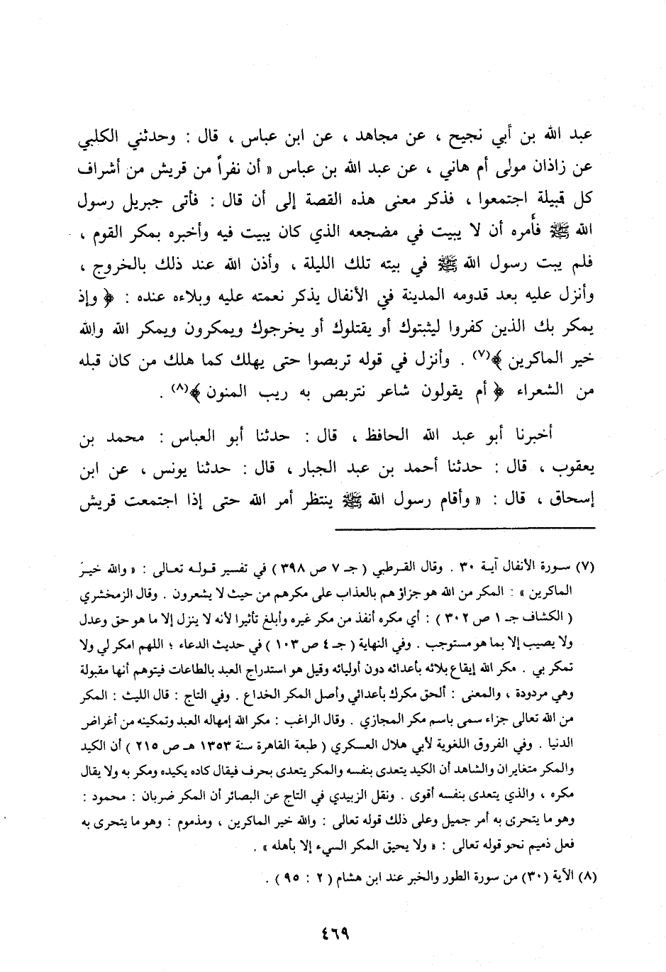 عَبْدِ اللهِ بْنِ أَبِي نَجِيحٍ، عَنْ مُجَاهِدٍ، عَنِ ابْنِ عَبَّاسٍ، قَالَ: وَحَدَّثَنِي الْكَلْبِيُّ عَنْ زَاذَانَ مَوْلَى أم هاني، عَنْ عَبْدِ اللهِ بْنِ عَبَّاسٍ «أَنَّ نَفَرًا مِنْ قُرَيْشٍ مِنْ أَشْرَافِ كُلِّ قَبِيلَةٍ اجْتَمَعُوا، فَذَكَرَ مَعْنَى هَذِهِ الْقِصَّةِ إِلَى أَنَّ قَالَ: فَأَتَى جِبْرِيلُ رَسُولَ اللهِ صَلَّى اللهُ عَلَيْهِ وآله وَسَلَّمَ فَأَمَرَهُ أَنْ لَا يَبِيتَ فِي مَضْجَعِهِ الَّذِي كَانَ يَبِيتُ فِيهِ وَأَخْبَرَهُ بِمَكْرِ الْقَوْمِ، فَلَمْ يَبِتْ رَسُولُ اللهِ صَلَّى الله عليه وآله وَسَلَّمَ فِي بَيْتِهِ تِلْكَ اللَّيْلَةَ، وَأَذِنَ اللهُ عِنْدَ ذَلِكَ بِالْخُرُوجِ، وَأَنْزَلَ عَلَيْهِ بَعْدَ قُدُومِهِ الْمَدِينَةَ فِي الْأَنْفَالِ يَذْكُرُ نِعْمَتَهُ عَلَيْهِ وَبَلَاءَهُ عِنْدَهُ: وَإِذْ يَمْكُرُ بِكَ الَّذِينَ كَفَرُوا لِيُثْبِتُوكَ أَوْ يَقْتُلُوكَ أَوْ يُخْرِجُوكَ وَيَمْكُرُونَ وَيَمْكُرُ اللَّهُ وَاللَّهُ خَيْرُ الْماكِرِينَ [ (7) ] . وَأَنْزَلَ فِي قَوْلِهِ تَرَبَّصُوا حَتَّى يَهْلِكَ كَمَا هَلَكَ مَنْ كَانَ قَبْلَهُ مِنَ الشُّعَرَاءِ أَمْ يَقُولُونَ شاعِرٌ نَتَرَبَّصُ بِهِ رَيْبَ الْمَنُونِ [ (8) ] .