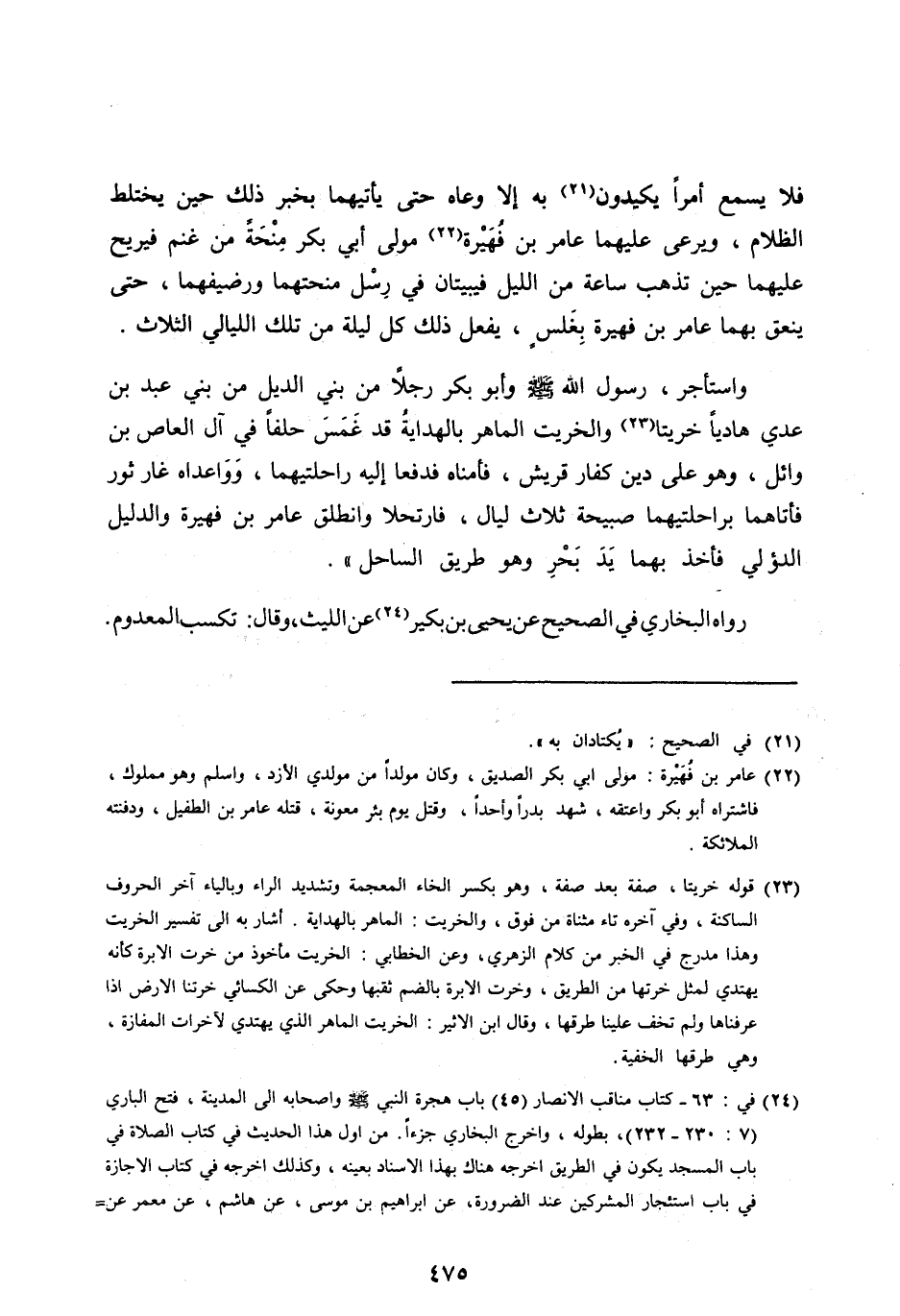 وَاسْتَأْجَرَ، رَسُولُ اللهِ صَلَّى الله عليه وآله وَسَلَّمَ وَأَبُو بَكْرٍ رَجُلًا مِنْ بَنِي الدِّيلِ مِنْ بَنِي عَبْدِ بْنِ عَدِيِّ هَادِيًا خِرِّيتًا [ (23) ] وَالْخِرِّيتُ الْمَاهِرُ بِالْهِدَايَةِ قَدْ غَمَسَ حِلْفًا فِي آلِ الْعَاصِ بْنِ وَائِلٍ، وَهُوَ عَلَى دِينِ كُفَّارِ قُرَيْشٍ، فَأَمِنَاهُ فَدَفَعَا إِلَيْهِ رَاحِلَتَيْهِمَا، وَوَاعَدَاهُ غَارَ ثَوْرٍ فَأَتَاهُمَا بِرَاحِلَتَيْهِمَا صَبِيحَةَ ثَلَاثِ لَيَالٍ، فَارْتَحَلَا وَانْطَلَقَ عَامِرُ بْنُ فُهَيْرَةَ وَالدَّلِيلُ الدُّؤَلِيُّ فَأَخَذَ بِهِمَا يَدَ بَحْرٍ وَهُوَ طَرِيقُ السَّاحِلِ» .