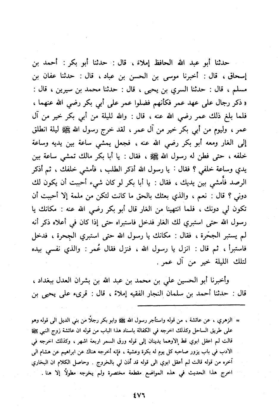 «ذُكِرَ رِجَالٌ عَلَى عَهْدِ عُمَرَ فَكَأَنَّهُمْ فَضَلُّوا عُمَرَ عَلَى أَبِي بَكْرٍ رَضِيَ اللهُ عَنْهُمَا، فَلَمَّا بَلَغَ ذَلِكَ عُمَرُ رَضِيَ اللهُ عَنْهُ، قَالَ: وَاللهِ لَلَيْلَةٌ مِنْ أَبِي بَكْرٍ خَيْرٌ مِنْ آلِ عُمَرَ، وَلَيَوْمٌ مِنْ أَبِي بَكْرٍ خَيْرٌ مِنْ آلِ عُمَرَ، لَقَدْ خَرَجَ رَسُولُ اللهِ صَلَّى اللهُ عَلَيْهِ وآله وَسَلَّمَ لَيْلَةَ انْطَلَقَ إِلَى الْغَارِ وَمَعَهُ أَبُو بَكْرٍ رَضِيَ اللهُ عَنْهُ، فَجَعَلَ يَمْشِي سَاعَةً بَيْنَ يَدَيْهِ وَسَاعَةً خَلْفَهُ، حَتَّى فَطِنَ لَهُ رَسُولُ اللهِ صَلَّى الله عليه وآله وَسَلَّمَ، فَقَالَ: يَا أَبَا بَكْرٍ مَالِكَ تَمْشِي سَاعَةً بَيْنَ يَدَيَّ وَسَاعَةً خَلْفِي؟ فَقَالَ. يَا رَسُولَ اللهِ أَذْكُرُ الطَّلَبَ، فَأَمْشِي خَلْفَكَ، ثُمَّ أَذْكُرُ الرَّصَدَ فَأَمْشِي بَيْنَ يَدَيْكَ، فَقَالَ: يَا أَبَا بَكْرٍ لَوْ كَانَ شَيْءٌ أَحْبَبْتَ أَنْ يَكُونَ لَكَ دُونِي؟ قَالَ: نَعَمْ، وَالَّذِي بَعَثَكَ بِالْحَقِّ مَا كَانَتْ لِتَكُنْ مِنْ مُلِمَّةٍ إِلَّا أَحْبَبْتُ أَنْ تَكُونَ لِي دُونَكَ،