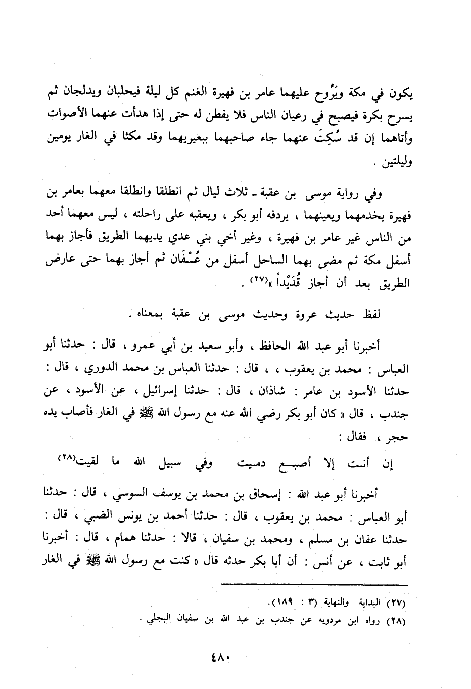 وَفِي رِوَايَةِ مُوسَى بْنِ عُقْبَةَ- ثَلَاثَ لَيَالٍ ثُمَّ انْطَلَقَا وَانْطَلَقَا مَعَهُمَا بِعَامِرِ بْنِ فُهَيْرَةَ يَخْدُمُهُمَا وَيُعِينُهُمَا، يُرْدِفُهُ أَبُو بَكْرٍ، وَيُعْقِبُهُ عَلَى رَاحِلَتِهِ، لَيْسَ مَعَهُمَا أَحَدٌ مِنَ النَّاسِ غَيْرُ عَامِرِ بْنِ فُهَيْرَةَ، وَغَيْرُ أَخِي بَنِي عدي يديهما الطَّرِيقَ فَأَجَازَ بِهِمَا أَسْفَلَ مَكَّةَ ثُمَّ مَضَى بِهِمَا السَّاحِلَ أَسْفَلَ مِنْ عُسْفَانَ ثُمَّ أَجَازَ بِهِمَا حَتَّى عَارَضَ الطَّرِيقَ بَعْدَ أَنْ أَجَازَ قُدَيْدًا» [ (27) ] .