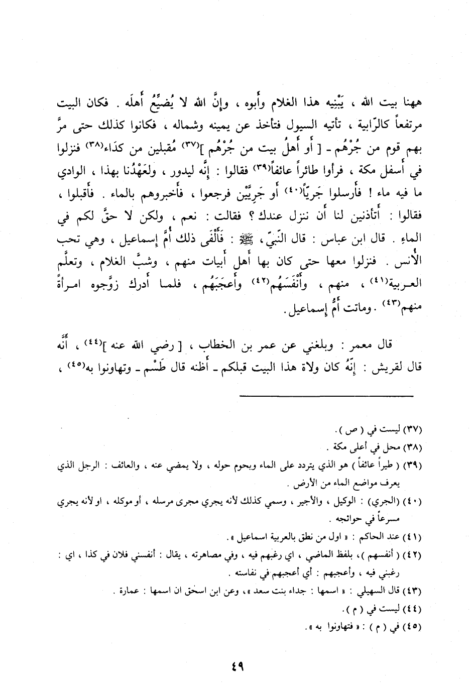 هَهُنَا بَيْتَ اللهِ، يَبْنِيهِ هَذَا الْغُلَامُ وَأَبُوهُ، وَإِنَّ اللهَ لَا يُضَيِّعُ أَهْلَهُ. فَكَانَ الْبَيْتُ مُرْتَفِعًا كَالرَّابِيَةِ، تَأْتِيهِ السُّيُولُ فَتَأْخُذُ عَنْ يَمِينِهِ وَشِمَالِهِ، فَكَانُوا كَذَلِكَ حَتَّى مَرَّ بِهِمْ قَوْمٌ مِنْ جُرْهُمٍ-[أَوْ أَهْلِ بَيْتٍ مِنْ جُرْهُمِ] [ (37) ] مُقْبِلِينَ مِنْ كَدَاءَ [ (38) ] فَنَزَلُوا فِي أَسْفَلِ مَكَّةَ، فَرَأَوْا طَائِرًا عَائِفًا [ (39) ] فَقَالُوا: إِنَّهُ لَيَدُورُ، وَلَعَهْدُنَا بِهَذَا، الْوَادِي مَا فِيهِ مَاءٌ! فَأَرْسَلُوا جَرِيًّا [ (40) ] أَوْ جَرِيَّيْنِ فَرَجَعُوا، فَأَخْبَرُوهُمْ بِالْمَاءِ. فَأَقْبَلُوا، فَقَالُوا: أَتَأْذَنِينَ لَنَا أَنْ نَنْزِلَ عِنْدَكَ؟ فَقَالَتْ: نَعَمْ، وَلَكِنْ لَا حَقَّ لَكُمْ فِي الْمَاءِ.