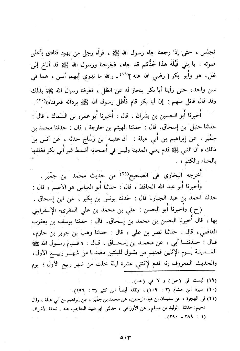 (ح) وأَخْبَرَنَا أَبُو الْحَسَنِ: عَلِيُّ بْنُ مُحَمَّدِ بْنِ عَلِيٍّ الْمُقْرِئُ الْإِسْفَرَايِنِيُّ بِهَا، قَالَ أَخْبَرَنَا الْحَسَنُ بْنُ مُحَمَّدِ بْنِ إِسْحَاقَ، قَالَ: حَدَّثَنَا يُوسُفُ بْنُ يَعْقُوبَ الْقَاضِي، قَالَ: حَدَّثَنَا نَصْرُ بْنُ عَلِيٍّ، قَالَ: حَدَّثَنَا وَهْبُ بْنُ جَرِيرِ بْنِ حَازِمٍ، قَالَ: حَدَّثَنَا أَبِي، عَنْ مُحَمَّدِ بْنِ إِسْحَاقَ، قَالَ: «قَدِمَ رَسُولُ اللهِ صَلَّى اللهُ عَلَيْهِ وآله وَسَلَّمَ الْمَدِينَةَ يَوْمَ الْإِثْنَيْنِ فَمِنْهُمْ مَنْ يَقُولُ لِلَيْلَتَيْنِ مَضَتَا مِنْ شَهْرِ رَبِيعٍ الْأَوَّلِ، وَالْحَدِيثُ الْمَعْرُوفُ أَنَّهُ قَدِمَ لِاثْنَتَيْ عَشْرَةَ لَيْلَةً خَلَتْ مِنْ شَهْرِ رَبِيعٍ الْأَوَّلِ، يوم