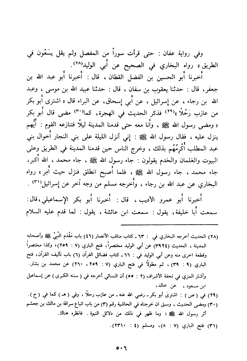 أَخْبَرَنَا أَبُو الْحُسَيْنِ بْنُ الْفَضْلِ الْقَطَّانُ، قَالَ: أَخْبَرَنَا أَبُو عَبْدِ اللهِ بْنُ جَعْفَرٍ، قَالَ: حَدَّثَنَا يَعْقُوبُ بْنُ سفان، قَالَ: حَدَّثَنَا عُبَيْدُ اللهِ بْنُ مُوسَى، وَعَبْدُ اللهِ بْنُ رَجَاءٍ، عَنْ إِسْرَائِيلَ، عَنْ أَبِي إِسْحَاقَ، عَنِ الْبَرَاءِ قَالَ «اشْتَرَى أَبُو بَكْرٍ مِنْ عَازِبٍ رَحْلًا» [ (29) ] فَذَكَرَ الْحَدِيثَ فِي الْهِجْرَةِ، كَمَا [ (30) ] مَضَى قَالَ أَبُو بَكْرٍ «وَمَضَى رَسُولُ اللهِ صَلَّى الله عليه وآله وَسَلَّمَ، وَأَنَا مَعَهُ حَتَّى قَدِمْنَا الْمَدِينَةَ لَيْلًا فَتَنَازَعَهُ الْقَوْمُ: أَيُّهُمْ يَنْزِلُ عَلَيْهِ، فَقَالَ رَسُولُ اللهِ صَلَّى اللهُ عَلَيْهِ وآله وَسَلَّمَ: إِنِّي أَنْزَلُ اللَّيْلَةَ عَلَى بَنِي النَّجَّارِ أَخْوَالِ بَنِي عَبْدِ الْمُطَّلِبِ أُكْرِمُهُمْ بِذَلِكَ، وَخَرَجَ النَّاسُ حِينَ قَدِمْنَا الْمَدِينَةَ فِي الطَّرِيقِ وَعَلَى الْبُيوتِ وَالْغِلْمَانُ وَالْخَدَمُ يَقُولُونَ: جَاءَ رَسُولُ اللهِ صَلَّى اللهُ عَلَيْهِ وآله وَسَلَّمَ، جَاءَ مُحَمَّدٌ، اللهُ أَكْبَرُ، جَاءَ مُحَمَّدٌ، جَاءَ رَسُولُ اللهِ صَلَّى الله عليه وآله وَسَلَّمَ، فَلَمَّا أَصْبَحَ انْطَلَقَ فَنَزَلَ حَيْثُ أُمِرَ» رَوَاهُ الْبُخَارِيُّ عَنْ عَبْدِ اللهِ بْنِ رَجَاءٍ، وَأَخْرَجَهُ مُسْلِمٌ مِنْ وَجْهٍ آخَرَ عَنْ إِسْرَائِيلَ [ (31) ] .