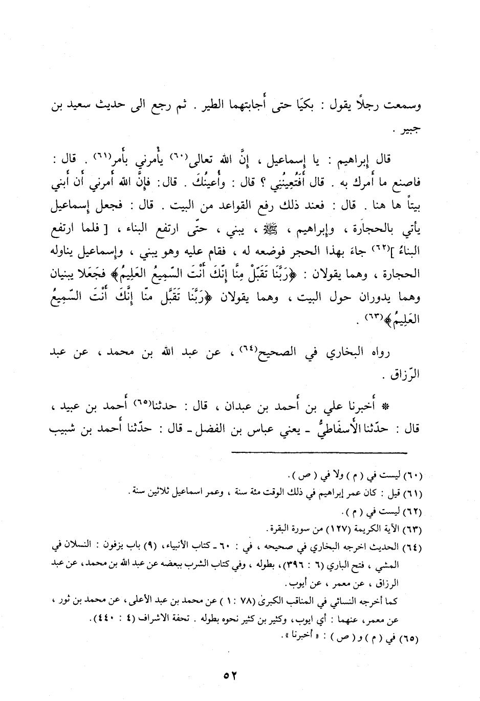 فَاصْنَعْ مَا أَمَرَكَ بِهِ. قَالَ أَفَتُعِينُنِي؟ قَالَ: وَأُعِينُكَ. قَالَ: فَإِنَّ اللهَ أَمَرَنِي أَنْ أَبْنِيَ بَيْتًا هَا هُنَا. قَالَ: فَعِنْدَ ذَلِكَ رَفَعَ الْقَوَاعِدَ مِنَ الْبَيْتِ. قَالَ: فَجَعَلَ إِسْمَاعِيلُ يَأْتِي بِالْحِجَارَةِ، وَإِبْرَاهِيمُ، صَلَّى اللهُ عليه وآله وَسَلَّمَ، يَبْنِي، حَتَّى ارْتَفَعَ الْبِنَاءُ، [فَلَمَّا ارْتَفَعَ الْبِنَاءُ] [ (62) ] جَاءَ بِهَذَا الْحَجَرِ فَوَضَعَهُ لَهُ، فَقَامَ عَلَيْهِ وَهُوَ يَبْنِي، وَإِسْمَاعِيلُ يُنَاوِلُهُ الْحِجَارَةَ، وَهُمَا يَقُولَانِ: رَبَّنا تَقَبَّلْ مِنَّا إِنَّكَ أَنْتَ السَّمِيعُ الْعَلِيمُ فَجَعَلَا يَبْنِيَانِ وَهُمَا يَدُورَانِ حَوْلَ الْبَيْتِ، وَهُمَا يَقُولَانِ رَبَّنا تَقَبَّلْ مِنَّا إِنَّكَ أَنْتَ السَّمِيعُ الْعَلِيمُ [ (63) ] .