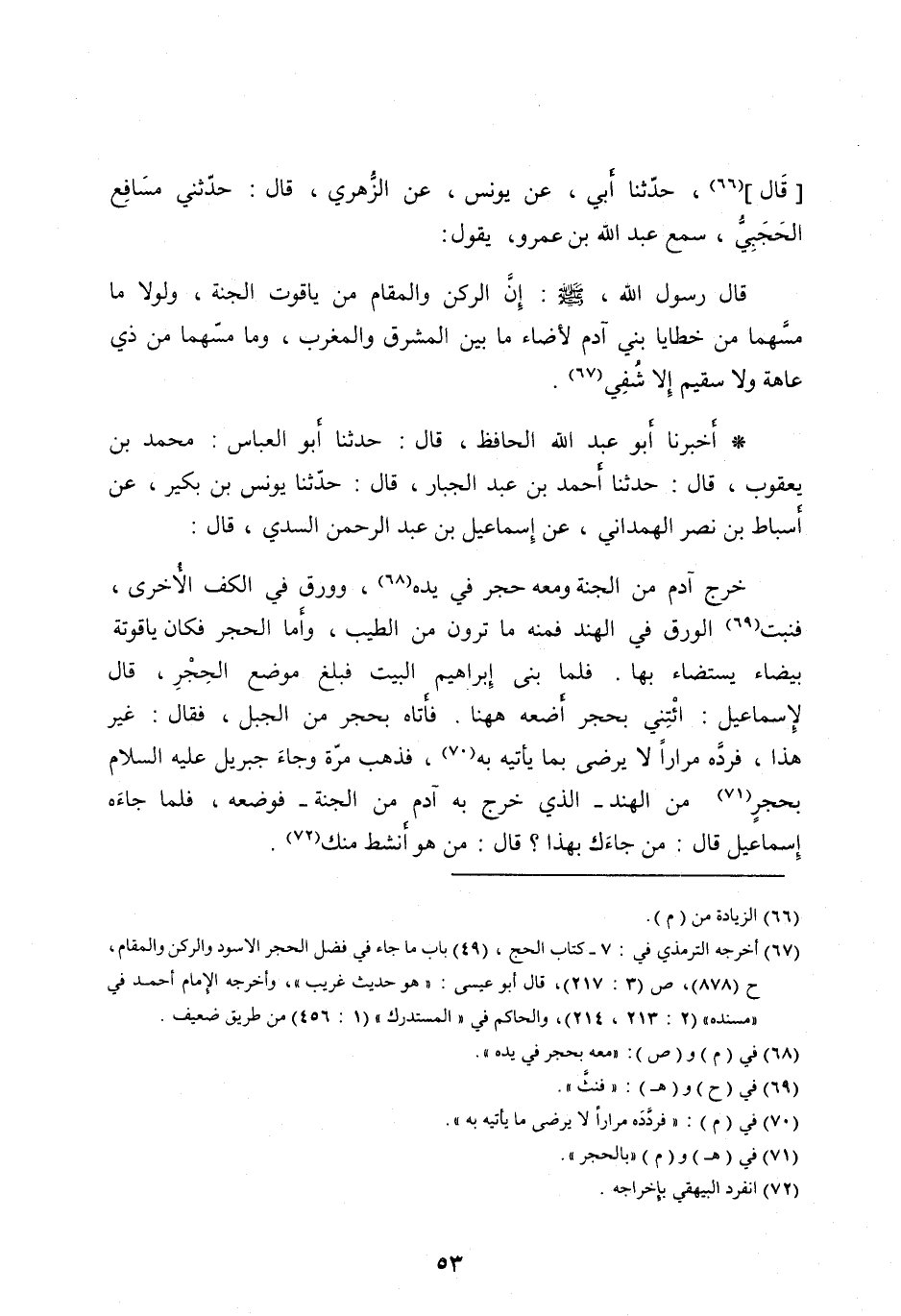 [ (67) ] أخرجه الترمذي في: 7- كتاب الحج، (49) بَابُ مَا جَاءَ فِي فضل الحجر الأسود والركن والمقام، ح (878) ، ص (3: 217) ، قال أبو عيسى: «هو حديث غريب» ، وأخرجه الإمام أحمد في «مسنده» (2: 213، 214) ، والحاكم في «المستدرك» (1: 456) من طريق ضعيف.