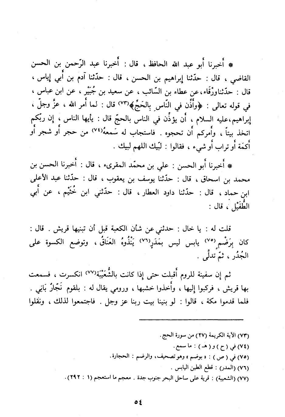 * أخبرنا أبو عبد الله الْحَافِظُ، قَالَ: أَخْبَرَنَا عَبْدُ الرَّحْمَنِ بْنُ الْحَسَنِ الْقَاضِي، قَالَ: حَدَّثَنَا إِبْرَاهِيمُ بْنُ الْحَسَنِ، قَالَ: حَدَّثَنَا آدَمُ بْنُ أَبِي إِيَاسٍ، قَالَ: حَدَّثَنَا وَرْقَاءُ، عَنْ عَطَاءِ بْنِ السَّائِبِ، عَنْ سَعِيدِ بْنِ جُبَيْرٍ، عَنِ ابْنِ عَبَّاسٍ، فِي قَوْلِهِ تَعَالَى: وَأَذِّنْ فِي النَّاسِ بِالْحَجِّ [ (73) ] قَالَ: لَمَّا أَمَرَ اللهُ، عَزَّ وَجَلَّ، إِبْرَاهِيمَ، عَلَيْهِ السَّلَامُ، أَنْ يُؤَذِّنَ فِي النَّاسِ بِالْحَجِّ قَالَ: يَا أَيُّها النَّاسُ، إِنَّ رَبَّكُمُ اتَّخَذَ بَيْتًا، وَأَمَرَكُمْ أَنْ تحجوه. فاستجاب له سَمِعَهُ [ (74) ] مِنْ حَجَرٍ أَوْ شَجَرٍ أَوْ أَكَمَةٍ أَوْ تُرَابٍ أَوْ شَيْءٍ، فَقَالُوا: لَبَّيْكَ اللهُمَّ لَبَّيْكَ.