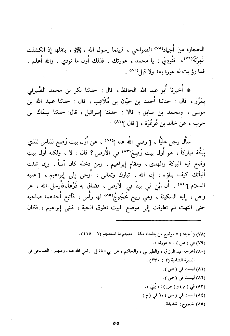 * أَخْبَرَنَا أَبُو عَبْدِ اللهِ الْحَافِظُ، قَالَ: حَدَّثَنَا بَكْرُ بْنُ مُحَمَّدٍ الصَّيْرَفِيُّ بِمَروَ، قَالَ: حَدَّثَنَا أَحْمَدُ بْنُ حَيَّانَ بْنِ مُلَاعِبٍ، قَالَ: حَدَّثَنَا عُبَيْدُ اللهِ بْنُ مُوسَى، وَمُحَمَّدُ بْنُ سَابِقٍ، قَالَا: حَدَّثَنَا إِسْرَائِيلُ، قَالَ: حَدَّثَنَا سِمَاكُ بْنُ حَرْبٍ، عن خالد بن عُرْعُرَةَ، [قَالَ] [ (81) ] : سَأَلَ رَجُلٌ عَلِيًّا، [رَضِيَ اللهُ عَنْهُ] [ (82) ] ، عَنْ أَوَّلِ بَيْتٍ وُضِعَ لِلنَّاسِ لَلَّذِي بِبَكَّةَ مُبَارَكًا، هُوَ أَوَّلُ بَيْتٍ وُضِعَ [ (83) ] فِي الْأَرْضِ؟ قَالَ: لَا، وَلَكِنَّهُ أَوَّلُ بَيْتِ وُضِعَ فِيهِ الْبَرَكَةُ وَالْهُدَى، وَمَقَامُ إِبْرَاهِيمَ، وَمَنْ دَخَلَهُ كَانَ آمَنَّا. وَإِنْ شِئْتَ أَنْبَأْتُكَ كَيْفَ بِنَاؤُهُ: إِنَّ اللهَ، تَبَارَكَ وَتَعَالَى: أَوْحَى إِلَى إِبْرَاهِيمَ، [عَلَيْهِ السَّلَامُ] [ (84) ] : أَنِ ابْنِ لِي بَيْتًا فِي الْأَرْضِ، فَضَاقَ بِهِ ذَرْعًا، فَأَرْسَلَ اللهُ، عَزَّ وَجَلَّ، إِلَيْهِ السَّكِينَةَ، وَهِيَ رِيحٌ خَجُوجٌ [ (85) ] لَهَا رَأْسٌ، فَاتَّبَعَ أَحَدُهُمَا صَاحِبَهُ حَتَّى انْتَهَتْ ثُمَّ تَطَوَّقَتْ إِلَى مَوْضِعِ الْبَيْتِ تَطَوُّقَ الْحَيَّةِ، فَبَنَى إبراهيم، فكان