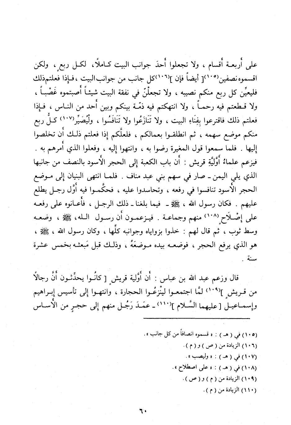 فَلَمَّا انْتَهَى الْبُنْيَانُ إِلَى مَوْضِعِ الْحَجَرِ الْأَسْوَدِ تَنَافَسُوا فِي رَفْعِهِ، وَتَحَاسَدُوا عَلَيْهِ، فَحَكَّمُوا فِيهِ أَوَّلَ رَجُلٍ يَطْلُعُ عَلَيْهِمْ. فَكَانَ رَسُولُ اللهِ، صَلَّى الله عليه وآله وَسَلَّمَ- فِيمَا بَلَغَنَا- ذَلِكَ الرَّجُلُ، فَأَعَانُوهُ عَلَى رَفْعِهِ عَلَى إِصْلَاحٍ [ (108) ] مِنْهُمْ وَجَمَاعَةٍ. فَيَزْعُمُونَ أَنْ رَسُولَ اللهِ، صَلَّى اللهُ عَلَيْهِ وآله وَسَلَّمَ، وَضَعَهُ وَسْطَ ثَوْبٍ، ثُمَّ قَالَ لَهُمْ: خُذُوا بِزَوَايَاهُ وَجَوَانِبِهِ كُلِّهَا، وَكَانَ رَسُولُ اللهِ، صَلَّى الله عليه وآله وَسَلَّمَ، هُوَ الَّذِي يَرْفَعُ الْحَجَرَ، فَوَضَعَهُ بِيَدِهِ مَوْضِعَهُ، وَذَلِكَ قَبْلَ مَبْعَثِهِ بِخَمْسَ عَشْرَةَ سَنَةً.