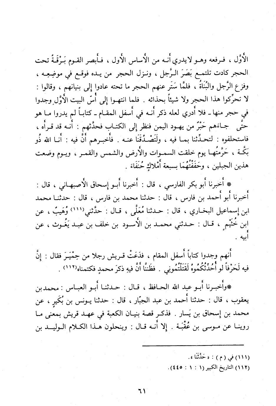 لَا تُحَرِّكُوا هَذَا الْحَجَرَ وَلَا شَيْئًا بِحِذَائِهِ. فَلَمَّا انْتَهَوْا إِلَى أُسِّ الْبَيْتِ الْأَوَّلِ وَجَدُوا فِي حَجَرٍ مِنْهَا- فَلَا أَدْرِي لَعَلَّهُ ذُكِرَ أَنْهُ فِي أَسْفَلِ الْمَقَامِ- كِتَابًا لَمْ يَدْرُوا مَا هُوَ حَتَّى جَاءَهُمْ حَبْرٌ مِنْ يَهُودِ الْيَمَنِ فَنَظَرَ إِلَى الْكِتَابِ فَحَدَّثَهُمْ: أَنَّهُ قَدْ قَرَأَهُ، فَاسْتَحْلَفُوهُ: لَتُحَدِّثَنَّا بِمَا فِيهِ، وَلْتَصْدُقَنَّا عَنْهُ. فَأَخْبَرَهُمْ أَنَّ فِيهِ: أَنَا اللهُ ذُو بَكَّةَ، حَرَّمْتُهَا يَوْمَ خلقت السموات وَالْأَرْضَ وَالشَّمْسَ وَالْقَمَرَ، وَيَوْمَ وَضَعْتُ هَذَيْنِ الْجَبَلَيْنِ، وَحَفَفْتُهُمَا بِسَبْعَةِ أَمْلَاكٍ حُنَفَاءَ.