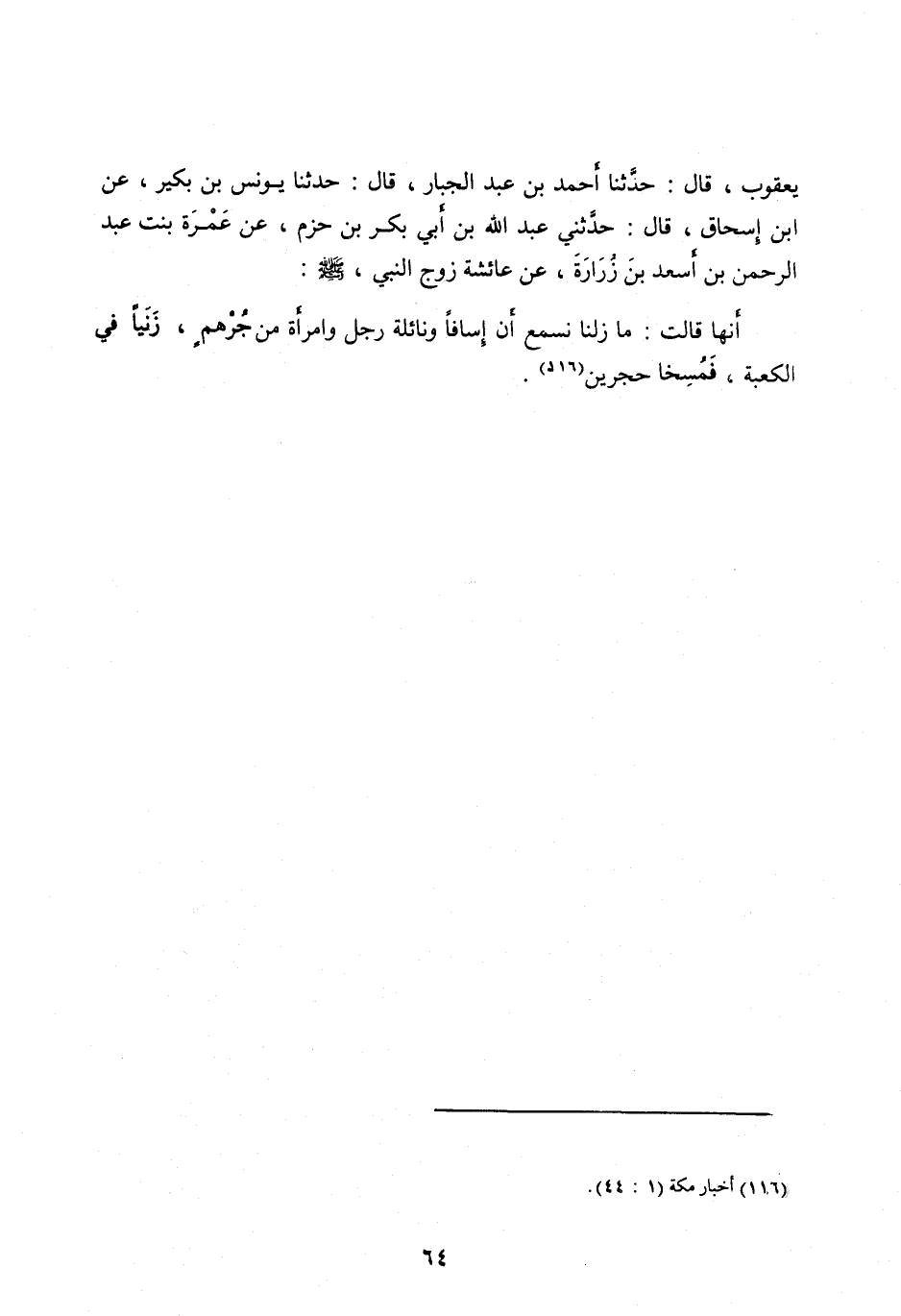 أَنَّهَا قَالَتْ: مَا زِلْنَا نَسْمَعُ أَنْ إِسَافًا وَنَائِلَةَ رَجُلٌ وَامْرَأَةٌ مِنْ جُرْهُمٍ، زَنَيَا فِي الْكَعْبَةِ، فَمُسِخَا حَجَرَيْنِ [ (116) ] .