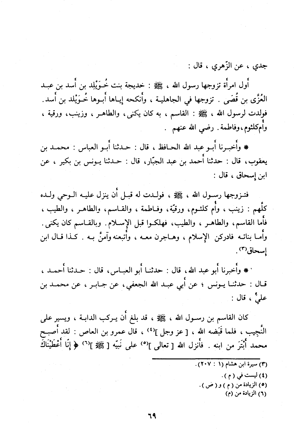 * وأَخْبَرَنَا أَبُو عَبْدِ اللهِ، قَالَ: حَدَّثَنَا أَبُو الْعَبَّاسِ، قَالَ: حَدَّثَنَا أَحْمَدُ، قَالَ: حَدَّثَنَا يُونُسُ، عَنْ أَبِي عَبْدِ اللهِ الْجُعْفِيِّ، عَنْ جَابِرٍ، عَنْ مُحَمَّدِ بْنِ عَلِيٍّ، قَالَ: كَانَ الْقَاسِمُ بْنُ رَسُولِ اللهِ، صَلَّى الله عليه وآله وَسَلَّمَ، قَدْ بَلَغَ أَنْ يَرْكَبَ الدَّابَّةَ، وَيَسِيرَ عَلَى النَّجِيبِ، فَلَمَّا قَبَضَهُ اللهُ، [عَزَّ وَجَلَّ] [ (4) ] ، قَالَ عَمْرُو بْنُ الْعَاصِ: لَقَدْ أَصْبَحَ مُحَمَّدٌ أَبْتَرَ مِنِ ابْنِهِ. فَأَنْزَلَ اللهُ [تَعَالَى] [ (5) ] عَلَى نبيه [صلى الله عليه وآله وَسَلَّمَ] [ (6) ] إِنَّا أَعْطَيْناكَ الْكَوْثَرَ