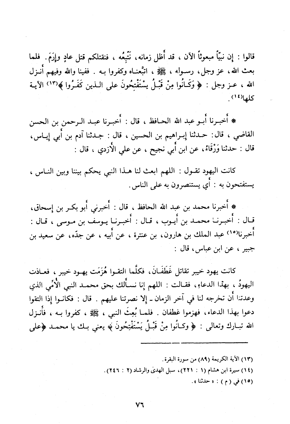 قَالُوا: إِنَّ نَبِيًّا مَبْعُوثًا الْآنَ، قَدْ أَظَلَّ زَمَانُهُ، نَتَّبِعُهُ، فَنَقْتُلُكُمْ قَتْلَ عَادٍ وإِرَمَ. فَلَمَّا بَعَثَ اللهُ، عَزَّ وَجَلَّ، رسوله، صلى الله عليه وآله وَسَلَّمَ، اتَّبَعْنَاهُ وَكَفَرُوا بِهِ. فَفِينَا وَاللهِ وَفِيهِمْ أَنْزَلَ اللهُ، عَزَّ وَجَلَّ: وَكانُوا مِنْ قَبْلُ يَسْتَفْتِحُونَ عَلَى الَّذِينَ كَفَرُوا [ (13) ] الْآيَةَ كُلَّهَا [ (14) ] .