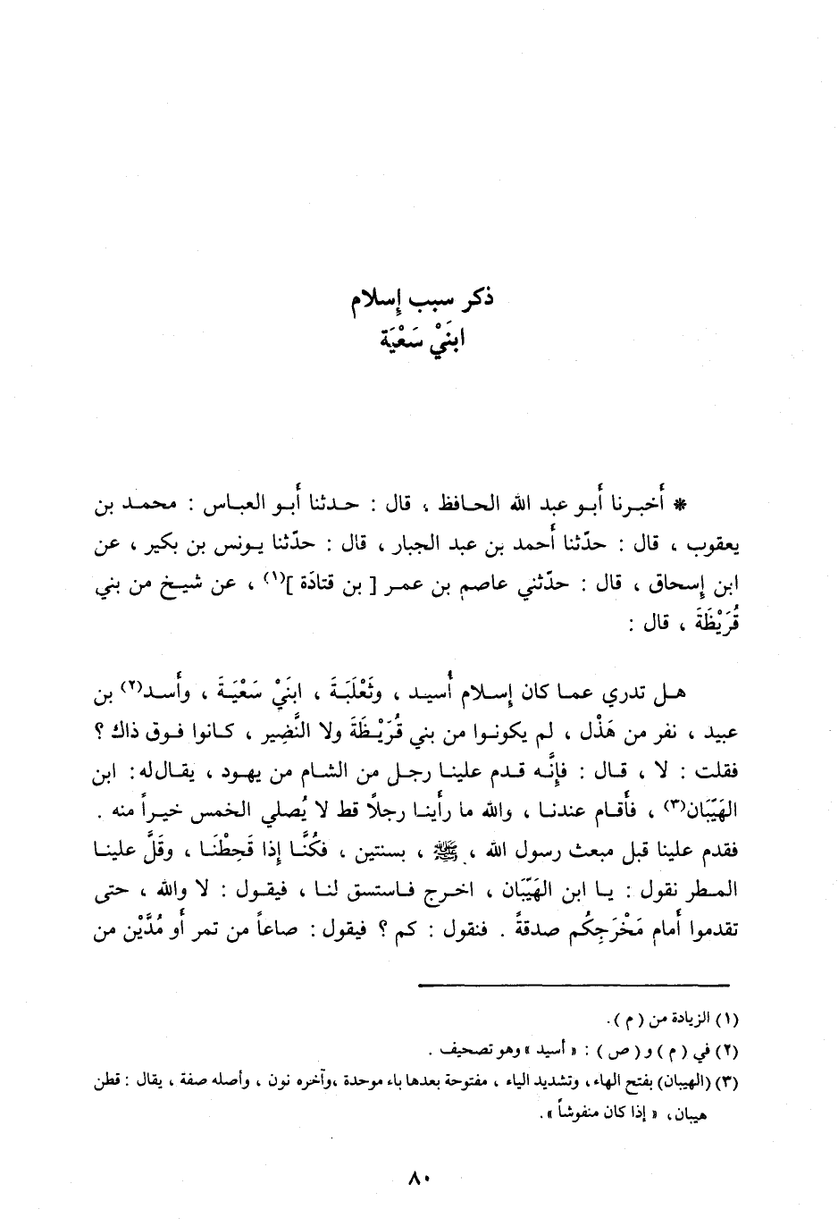 هَلْ تَدْرِي عَمَّا كَانَ إِسْلَامِ أُسَيْدٍ، وَثَعْلَبَةَ، ابْنَيْ سَعْيَةَ، وَأَسَدِ [ (2) ] بْنِ عُبَيْدٍ، نَفَرٌ مِنْ هَذْلٍ، لَمْ يَكُونُوا مِنْ بَنِي قُرَيْظَةَ وَلَا النَّضِيرِ، كَانُوا فَوْقَ ذَاكَ؟