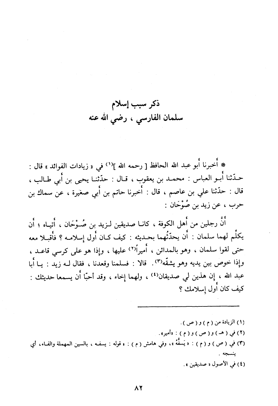 أَنَّ رَجُلَيْنِ مِنْ أَهْلِ الْكُوفَةِ، كَانَا صَدِيقَيْنِ لِزَيْدِ بْنِ صُوحَانَ، أَتَيَاهُ، أَنْ يُكَلِّمَ لَهُمَا سَلْمَانَ: أَنْ يُحَدِّثَهُمَا بِحَدِيثِهِ: كَيْفَ كَانَ أَوَّلُ إِسْلَامِهِ؟ فَأَقْبَلَا مَعَهُ حَتَّى لَقَوْا سَلْمَانَ، وَهُوَ بِالْمَدَائِنِ، أَمِيرًا [ (2) ] عَلَيْهَا، وَإِذَا هُوَ عَلَى كُرْسِيٍّ قَاعِدٌ، وَإِذَا خُوصٌ بَيْنَ يَدَيْهِ وَهُوَ يَشُقُّهُ [ (3) ] . قَالَا: فَسَلَّمْنَا وَقَعَدْنَا، فَقَالَ لَهُ زَيْدٌ: يَا أَبَا عَبْدِ اللهِ، إِنَّ هَذَيْنِ لِي صَدِيقَانِ [ (4) ] ، وَلَهُمَا إِخَاءٌ، وَقَدْ أَحَبَّا أَنْ يَسْمَعَا حَدِيثَكَ: