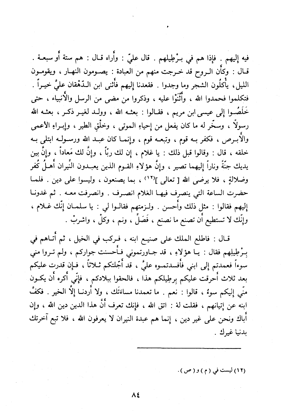 قَالَ: فَاطَّلَعَ الْمَلِكُ عَلَى صَنِيعِ ابْنِهِ، فَرَكِبَ فِي الْخَيْلِ، ثُمَّ أَتَاهُمْ فِي بِرْطِيلِهِمْ فَقَالَ: يَا هَؤُلَاءِ، قَدْ جَاوَرْتُمُونِي فَأَحْسَنْتُ جِوَارَكُمْ، وَلَمْ تَرَوْا مِنِّي سُوءًا فَعَمِدْتُمْ إِلَى ابْنِي فَأَفْسَدْتُمُوهُ عَلَيَّ، قَدْ أَجَّلْتُكُمْ ثَلَاثًا، فَإِنْ قَدَرْتُ عَلَيْكُمْ بَعْدَ ثَلَاثٍ أَحْرَقْتُ عَلَيْكُمْ بِرْطِيلَكُمْ هَذَا، فَالْحَقُوا بِبِلَادِكُمْ، فَإِنِّي أَكْرَهُ أَنْ يَكُونَ مِنِّي إِلَيْكُمْ سُوءٌ، قَالُوا: نَعَمْ. مَا تَعَمَّدْنَا مَسَاءَتَكَ، وَلَا أَرَدْنَا إِلَّا الْخَيْرَ. فَكَفَّ ابْنُهُ عَنْ إِتْيَانِهِمْ، فَقُلْتُ لَهُ: اتَّقِ اللهَ، فَإِنَّكَ تَعْرِفُ أَنَّ هَذَا الدِّينَ دِينُ اللهِ، وَإِنَّ أَبَاكَ وَنَحْنُ عَلَى غَيْرِ دِينٍ، إِنَّمَا هُمْ عَبْدَةُ النِّيرَانِ لَا يَعْرِفُونَ اللهَ، فَلَا تَبِعْ آخِرَتَكَ بِدُنْيَا غَيْرِكَ.