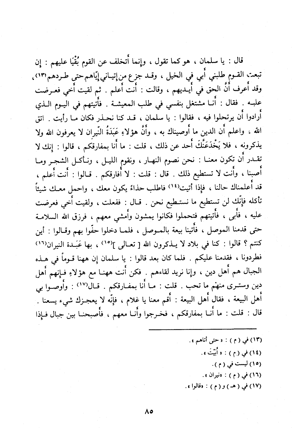 قَالَ: يَا سَلْمَانُ، هُوَ كَمَا تَقُولُ، وَإِنَّمَا أَتَخَلَّفُ عَنِ الْقَوْمِ بُقْيًا عَلَيْهِمْ: إِنْ تَبِعْتُ الْقَوْمَ طَلَبَني أَبِي فِي الْخَيْلِ، وَقَدْ جَزَعَ مِنْ إِتْيَانِي إِيَّاهُمْ حَتَّى طَرَدَهُمْ [ (13) ] ، وَقَدْ أَعْرِفُ أَنَّ الْحَقَّ فِي أَيْدِيهِمْ، وقالت: أَنْتَ أَعْلَمُ. ثُمَّ لَقِيتُ أَخِي فَعَرَضْتُ عَلَيْهِ. فَقَالَ: أَنَا مُشْتَغِلٌ بِنَفْسِي فِي طَلَبِ الْمَعِيشَةِ. فَأَتَيْتُهُمْ فِي الْيَوْمِ الَّذِي أَرَادُوا أَنْ يَرْتَحِلُوا فِيهِ، فَقَالُوا: يَا سَلْمَانُ، قَدْ كُنَّا نَحْذَرُ فَكَانَ مَا رَأَيْتَ. اتَّقِ اللهَ، وَاعْلَمْ أَنَّ الدِّينَ مَا أَوْصَيْنَاكَ بِهِ، وَأَنَّ هَؤُلَاءِ عَبْدَةُ النِّيرَانِ لَا يَعْرِفُونَ اللهَ وَلَا يَذْكُرُونَهُ، فَلَا يَخْدَعَنَّكَ أَحَدٌ عَنْ ذَلِكَ، قُلْتُ: مَا أَنَا بِمُفَارِقِكُمْ، قَالُوا: إِنَّكَ لَا تَقْدِرُ أَنْ تَكُونَ مَعَنَا: نَحْنُ نَصُومُ النَّهَارَ، وَنَقُومُ اللَّيْلَ، وَنَأْكُلُ الشَّجَرَ وَمَا أَصَبْنَا، وَأَنْتَ لَا تَسْتَطِيعُ ذَلِكَ. قَالَ: قُلْتُ: لَا أُفَارِقُكُمْ. قَالُوا: أَنْتَ أَعْلَمُ، قَدْ أَعْلَمْنَاكَ حَالَنَا، فَإِذَا أَتَيْتَ [ (14) ] فَاطْلُبْ حِذَاءً يَكُونُ مَعَكَ، وَاحْمِلْ مَعَكَ شَيْئًا تَأْكُلُهُ فَإِنَّكَ لَنْ تَسْتَطِيعَ مَا نَسْتَطِيعُ نَحْنُ. قَالَ: فَفَعَلْتُ، وَلَقِيتُ أَخِي فَعَرَضْتُ عَلَيْهِ، فَأَبَى، فَأَتَيْتُهُمْ فَتَحَمَّلُوا فَكَانُوا يَمْشُونَ وَأَمْشِي مَعَهُمْ، فَرَزَقَ اللهُ السَّلَامَةَ حَتَّى قَدِمْنَا الْمَوْصِلَ، فَأَتَيْنَا بِيْعَةً بِالْمَوْصِلِ، فَلَمَّا دَخَلُوا حَفُّوا بِهِمْ وَقَالُوا: أَيْنَ كُنْتُمْ؟ قَالُوا: كُنَّا فِي بِلَادٍ لَا يَذْكُرُونَ اللهَ [تَعَالَى] [ (15) ] ، بِهَا عَبْدَةُ النِّيرَانِ [ (16) ] فَطَرَدُونَا، فَقَدِمْنَا عَلَيْكُمْ. فَلَمَّا كَانَ بَعْدُ قَالُوا: يَا سَلْمَانُ إِنَّ هَهُنَا قَوْمًا فِي هَذِهِ الْجِبَالِ هُمْ أَهْلُ دِينٍ، وَإِنَّا نُرِيدُ لِقَاءَهُمْ. فَكُنْ أَنْتَ هَهُنَا مَعَ هَؤُلَاءِ فَإِنَّهُمْ أَهْلُ دِينٍ وَسَتَرَى مِنْهُمْ مَا تُحِبُّ. قُلْتُ: مَا أَنَا بِمُفَارِقِكُمْ. قَالَ [ (17) ] : وَأَوْصُوا بِي أَهْلَ الْبِيعَةِ، فَقَالَ أَهْلُ الْبِيْعَةِ: أَقِمْ مَعَنَا يَا غُلَامُ، فَإِنَّهُ لَا يُعْجِزُكَ شَيْءٌ يَسَعُنَا.