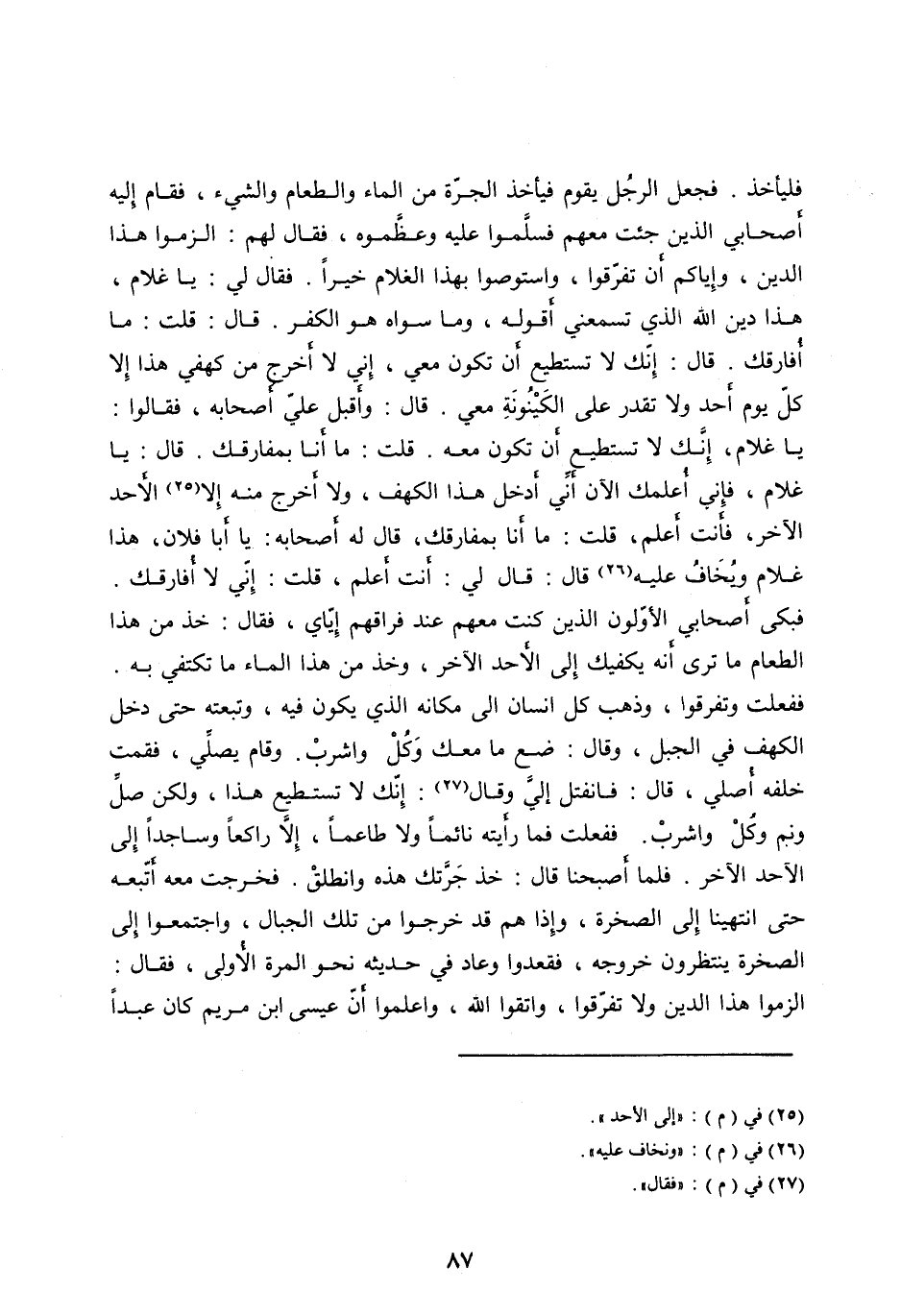 يَا غُلَامُ، إنَ لَا تَسْتَطِيعُ أَنْ تَكُونَ مَعَهُ. قُلْتُ: مَا أَنَا بِمُفَارِقِكَ. قَالَ: يَا غُلَامُ، فَإِنِّي أُعْلِمُكَ الْآنَ أَنِّي أَدْخُلُ هَذَا الْكَهْفَ، وَلَا أَخْرُجُ مِنْهُ إِلَّا [ (25) ] الْأَحَدَ الْآخَرَ، فَأَنْتَ أَعْلَمُ، قُلْتُ: مَا أَنَا بِمُفَارِقِكَ، قَالَ لَهُ أَصْحَابُهُ: يَا أَبَا فُلَانُ، هَذَا غُلَامٌ وَيُخَافُ عَلَيْهِ [ (26) ] قَالَ: قَالَ لِي: أَنْتَ أَعْلَمُ، قُلْتُ: إِنِّي لَا أُفَارِقُكَ.