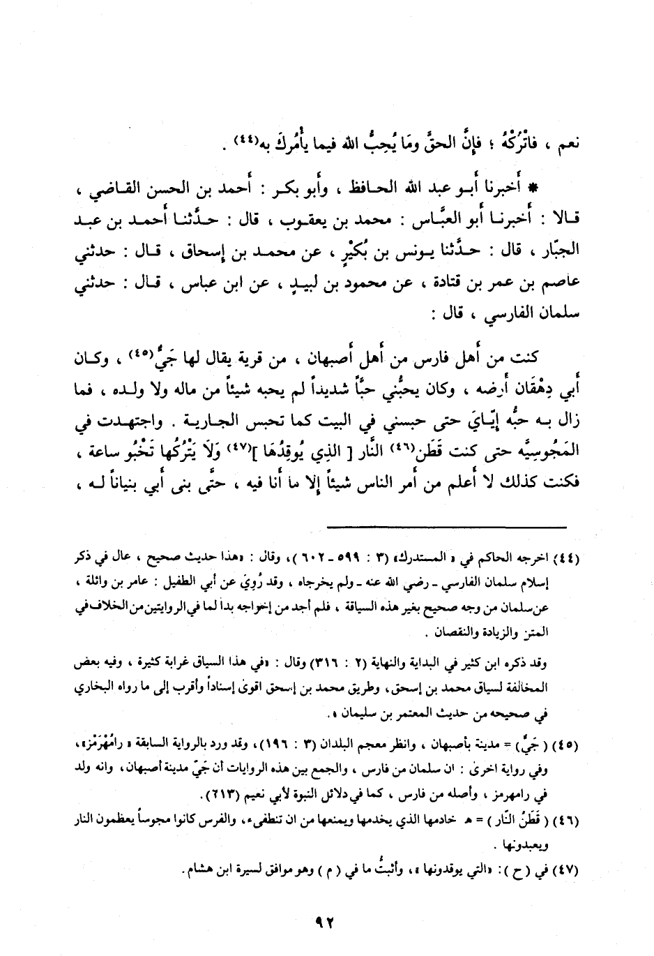 كُنْتُ مِنْ أَهْلِ فَارِسَ مِنْ أَهْلِ أَصْبَهَانَ، مِنْ قَرْيَةٍ يُقَالُ لَهَا جَيُّ [ (45) ] ، وَكَانَ أَبِي دِهْقَانَ أَرْضِهِ، وَكَانَ يُحِبُّنِي حُبًّا شَدِيدًا لَمْ يُحِبَّهُ شَيْئًا مِنْ مَالِهِ وَلَا وَلَدِهِ، فَمَا زَالَ بِهِ حُبُّهُ إِيَّايَ حَتَّى حَبَسَنِي فِي الْبَيْتِ كَمَا تُحْبَسُ الْجَارِيَةُ. وَاجْتَهَدْتُ فِي الْمَجُوسِيَّةِ حَتَّى كُنْتُ قَطَنَ [ (46) ] النَّارِ [الَّذِي يُوقِدُهَا] [ (47) ] وَلَا يَتْرُكُهَا تَخْبُو سَاعَةً، فَكُنْتُ كَذَلِكَ لَا أَعْلَمُ مِنْ أَمْرِ النَّاسِ شَيْئًا إِلَّا مَا أَنَا فِيهِ، حَتَّى بَنَى أبي بنيانا له،