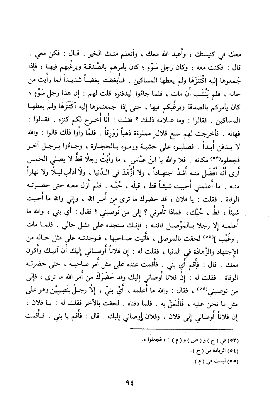 فَهَاتِهِ. فَأَخْرَجْتُ لَهُمْ سَبْعَ قِلَالٍ مَمْلُوءَةٍ ذَهَبًا وَوَرِقًا. فَلَمَّا رَأَوْا ذَلِكَ قَالُوا: وَاللهِ لَا يُدْفَنُ أَبَدًا. فَصَلَبُوهُ عَلَى خَشَبَةٍ وَرَمَوهُ بِالْحِجَارَةِ، وَجَاءُوا بِرَجُلٍ آخَرَ فَجَعَلُوهُ [ (53) ] مَكَانَهُ. فَلَا وَاللهِ يَا ابْنَ عَبَّاسٍ، مَا رَأَيْتُ رَجُلًا قَطُّ لَا يُصَلِّي الْخَمْسَ أَرَى أَنَّهُ أَفْضَلُ مِنْهُ أَشَدَّ اجْتِهَادًا، وَلَا أَزْهَدَ فِي الدُّنْيَا، وَلَا أَدْأَبَ لَيْلًا وَلَا نَهَارًا مِنْهُ. مَا أَعْلَمُنِي أَحْبَبْتُ شَيْئًا قَطُّ، قَبْلَهُ، حُبَّهُ. فَلَمْ أَزَلْ مَعَهُ حَتَّى حَضَرَتْهُ الْوَفَاةُ. فَقُلْتُ: يَا فُلَانُ، قَدْ حَضَرَكَ مَا تَرَى مِنْ أَمْرِ اللهِ، وَإِنِّي وَاللهِ مَا أَحْبَبْتُ شَيْئًا، قَطُّ، حبّك، فماذا تأمرني؟ إلى مَنْ تُوصِينِي؟ فَقَالَ: أَيْ بُنَيَّ، وَاللهِ مَا أَعْلَمُهُ إِلَّا رَجُلًا بِالْمَوْصِلِ فَائْتِهِ، فَإِنَّكَ سَتَجِدُهُ عَلَى مِثْلِ حَالِي. فَلَمَّا مَاتَ [وَغُيِّبَ] [ (54) ] لَحِقْتُ بِالْمَوْصِلِ، فَأَتَيْتُ صَاحِبَهَا، فَوَجَدْتُهُ عَلَى مِثْلِ حَالِهِ مِنَ الِاجْتِهَادِ وَالزَّهَادَةِ فِي الدُّنْيَا، فَقُلْتُ لَهُ: إِنَّ فُلَانًا أَوْصَانِي إِلَيْكَ أَنْ آتِيَكَ وَأَكُونَ مَعَكَ. قَالَ: فَأَقِمْ أَيْ بُنَيَّ. فَأَقَمْتُ عِنْدَهُ عَلَى مِثْلِ أَمْرِ صَاحِبِهِ، حَتَّى حَضَرَتْهُ الْوَفَاةُ. فَقُلْتُ لَهُ: إِنَّ فُلَانًا أَوْصَانِي إِلَيْكَ وقَدْ حَضَرَكَ مِنْ أَمْرِ اللهِ مَا تَرَى، فَإِلَى مَنْ تُوصِينِي [ (55) ] ، فَقَالَ: وَاللهِ مَا أَعْلَمُهُ، أَيْ بُنَيَّ، إِلَّا رَجُلٌ بِنَصِيبِينَ وَهُوَ عَلَى مِثْلِ مَا نَحْنُ عَلَيْهِ، فَالْحَقْ بِهِ. فَلَمَّا دَفَنَّاهُ. لَحِقْتُ بِالْآخَرِ فَقُلْتُ لَهُ: يَا فُلَانُ، إِنَّ فُلَانًا أَوْصَانِي إِلَى فُلَانٍ، وَفُلَانٌ أَوْصَانِي إِلَيْكَ. قَالَ: فَأَقِمْ يَا بُنَيَّ. فَأَقَمْتُ
