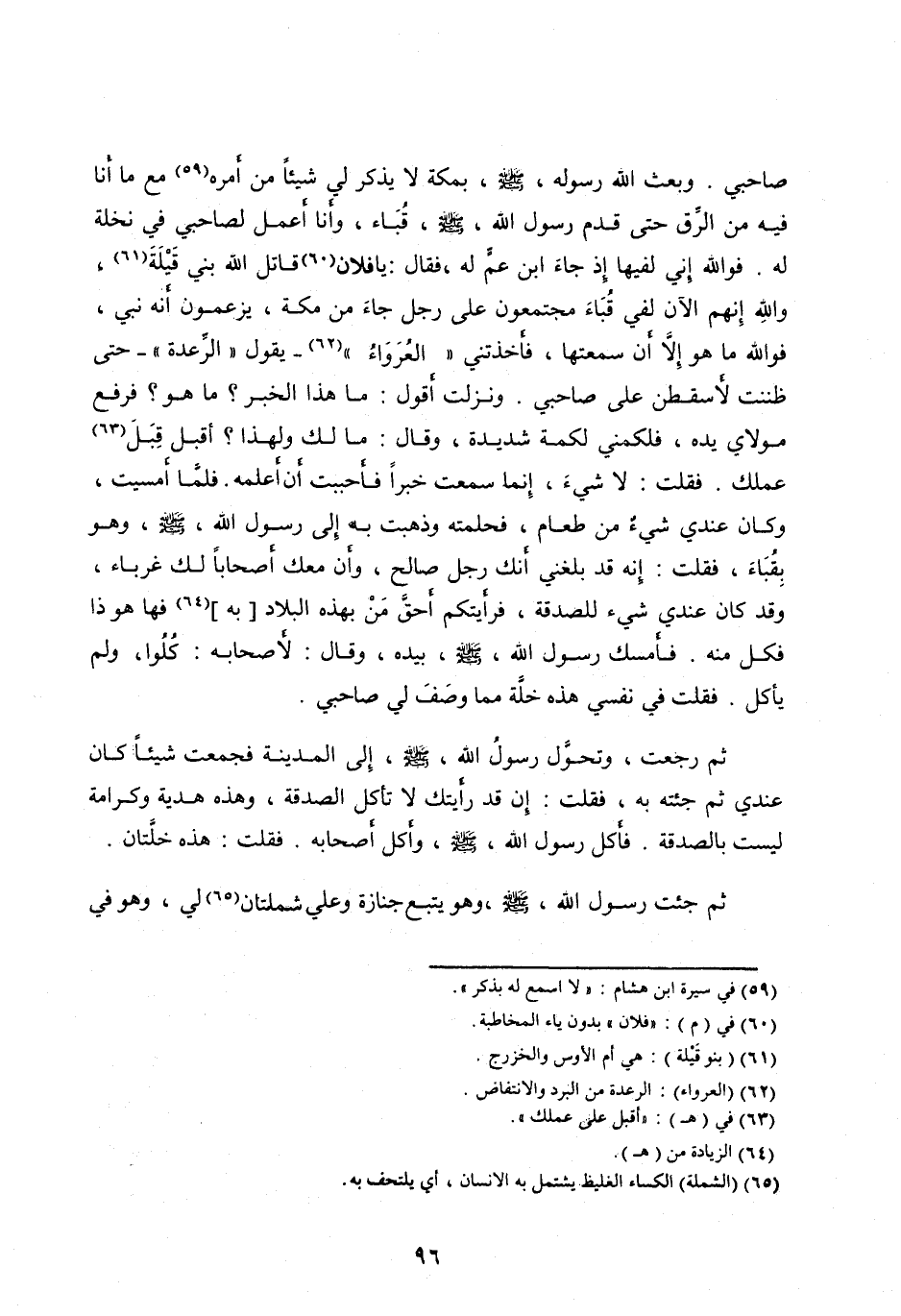صَاحِبِي. وَبَعَثَ اللهُ رَسُولَهُ، صَلَّى اللهُ عليه وآله وَسَلَّمَ، بِمَكَّةَ لَا يَذْكُرُ لِي شَيْئًا مِنْ أَمْرِهِ [ (59) ] مَعَ مَا أَنَا فِيهِ مِنَ الرِّقِّ حَتَّى قَدِمَ رَسُولُ اللهِ، صَلَّى اللهُ عَلَيْهِ وآله وَسَلَّمَ، قُبَاءَ، وَأَنَا أَعْمَلُ لِصَاحِبِي فِي نَخْلَةٍ لَهُ. فو الله إِنِّي لَفِيهَا إِذْ جَاءَ ابْنُ عَمٍّ لَهُ، فَقَالَ: يَا فُلَانُ [ (60) ] قَاتَلَ اللهُ بَنِي قَيْلَةَ [ (61) ] ، وَاللهِ إِنَّهُمُ الْآنَ لَفِي قُبَاءَ مُجْتَمِعُونَ عَلَى رَجُلٍ جَاءَ مِنْ مَكَّةَ، يَزْعُمُونَ أَنَّهُ نَبِيٌّ، فو الله مَا هُوَ إِلَّا أَنْ سَمِعْتُهَا، فَأَخَذَتْنِي «الْعُرَوَاءُ» [ (62) ]- يَقُولُ «الرَّعْدَةُ» - حَتَّى ظَنَنْتُ لَأَسْقُطَنَّ عَلَى صَاحِبِي. وَنَزَلْتُ أَقُولُ: مَا هَذَا الْخَبَرُ؟ مَا هُوَ؟ فَرَفَعَ مَوْلَايَ يَدَهُ، فَلَكَمَنِي لَكْمَةً شَدِيدَةً، وَقَالَ: مَا لَكَ وَلِهَذَا؟ أَقْبِلْ قِبَلَ [ (63) ] عَمَلِكَ. فَقُلْتُ: لَا شَيْءَ، إِنَّمَا سَمِعْتُ خَبَرًا فَأَحْبَبْتُ أَنْ أَعْلَمَهُ.