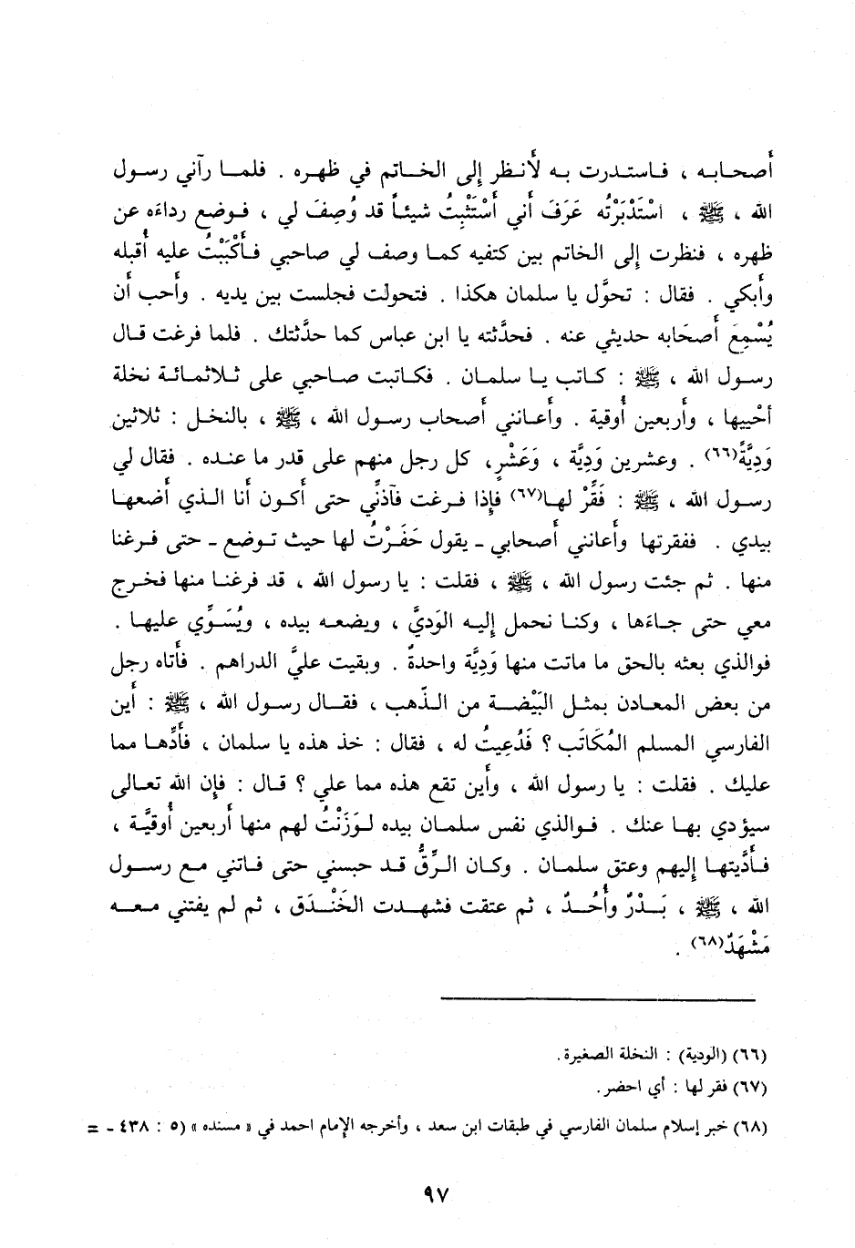أَصْحَابِهِ، فَاسْتَدَرْتُ بِهِ لَأَنْظُرَ إِلَى الْخَاتَمِ فِي ظَهْرِهِ. فَلَمَّا رَآنِي رَسُولُ اللهِ، صَلَّى اللهُ عَلَيْهِ وآله وَسَلَّمَ، اسْتَدْبَرْتُهُ عَرَفَ أَنِّي أَسْتَثْبِتُ شَيْئًا قَدْ وُصِفَ لِي، فَوَضَعَ رِدَاءَهُ عَنْ ظَهْرِهِ، فَنَظَرْتُ إِلَى الْخَاتَمِ بَيْنَ كَتِفَيْهِ كَمَا وَصَفَ لِي صَاحِبِي فَأَكْبَبْتُ عَلَيْهِ أُقَبِّلُهُ وَأَبْكِي. فَقَالَ: تَحَوَّلْ يَا سَلْمَانُ هَكَذَا. فَتَحَوَّلْتُ فَجَلَسْتُ بَيْنَ يَدَيْهِ. وَأَحَبَّ أَنْ يُسْمِعَ أَصْحَابَهُ حَدِيثِي عَنْهُ. فَحَدَّثْتُهُ يَا ابْنَ عَبَّاسٍ كَمَا حَدَّثْتُكَ. فَلَمَّا فَرَغْتُ قَالَ رَسُولُ اللهِ، صَلَّى الله عليه وآله وَسَلَّمَ: كَاتِبْ يَا سَلْمَانُ. فَكَاتَبْتُ صَاحِبِي عَلَى ثَلَاثِمِائَةِ نَخْلَةٍ أُحْيِيهَا، وَأَرْبَعِينَ أُوقِيَّةً. وَأَعَانَنِي أَصْحَابُ رَسُولِ اللهِ، صلى الله عليه وآله وَسَلَّمَ، بِالنَّخْلِ: ثَلَاثِينَ وَدِيَّةً [ (66) ] . وعشرين وديّة، وعشر، كُلُّ رَجُلٍ مِنْهُمْ عَلَى قَدْرِ مَا عِنْدَهُ. فَقَالَ لِي رَسُولُ اللهِ، صَلَّى اللهُ عَلَيْهِ وآله وَسَلَّمَ: فَقِّرْ لَهَا [ (67) ] فَإِذَا فَرَغْتَ فَآذِنِّي حَتَّى أَكُونَ أَنَا الَّذِي أَضَعُهَا بِيَدِي. فَفَقَّرْتُهَا وَأَعَانَنِي أَصْحَابِي- يَقُولُ حَفَرْتُ لَهَا حَيْثُ تُوضَعُ- حَتَّى فَرَغْنَا مِنْهَا. ثُمَّ جِئْتُ رَسُولَ اللهِ، صَلَّى اللهُ عَلَيْهِ وآله وَسَلَّمَ، فَقُلْتُ: يَا رَسُولَ اللهِ، قَدْ فَرَغْنَا مِنْهَا فَخَرَجَ مَعِي حَتَّى جَاءَهَا، وَكُنَّا نَحْمِلُ إِلَيْهِ الْوَدِيَّ، وَيَضَعُهُ بِيَدِهِ، وَيُسَوِّي عَلَيْهَا.