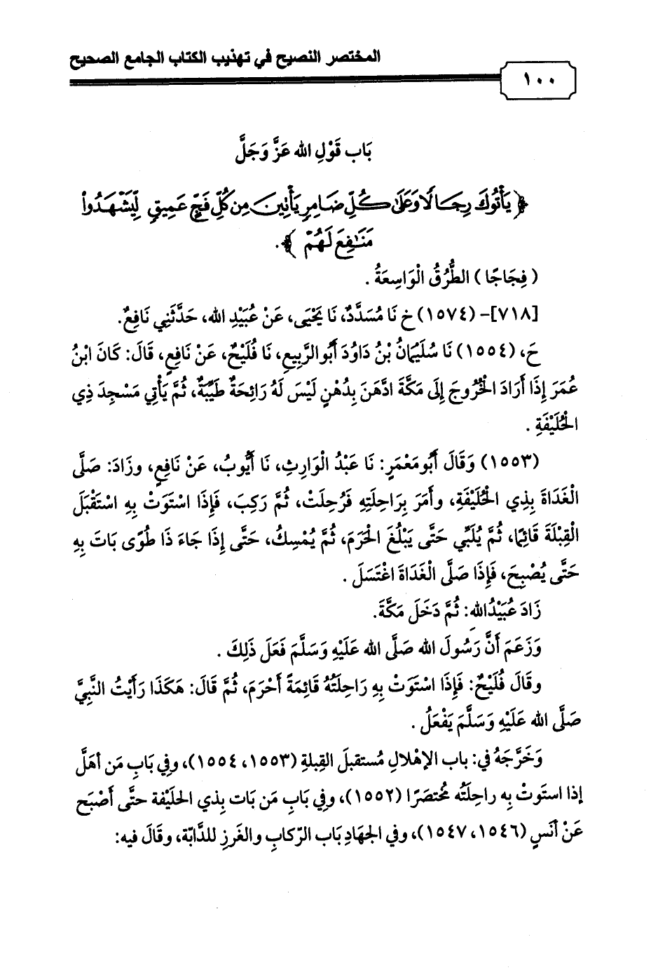 (1553) وَقَالَ أَبُومَعْمَرٍ: نَا عَبْدُ الْوَارِثِ، نَا أَيُّوبُ، عَنْ نَافِعٍ, وزَادَ: صَلَّى الْغَدَاةَ بِذِي الْحُلَيْفَةِ, وأَمَرَ بِرَاحِلَتِهِ فَرُحِلَتْ، ثُمَّ رَكِبَ، فَإِذَا اسْتَوَتْ بِهِ اسْتَقْبَلَ الْقِبْلَةَ قَائِمًا, ثُمَّ يُلَبِّي حَتَّى يَبْلُغَ الْحَرَمَ, ثُمَّ يُمْسِكُ, حَتَّى إِذَا جَاءَ ذَا طُوًى بَاتَ بِهِ حَتَّى يُصْبِحَ, فَإِذَا صَلَّى الْغَدَاةَ اغْتَسَلَ.