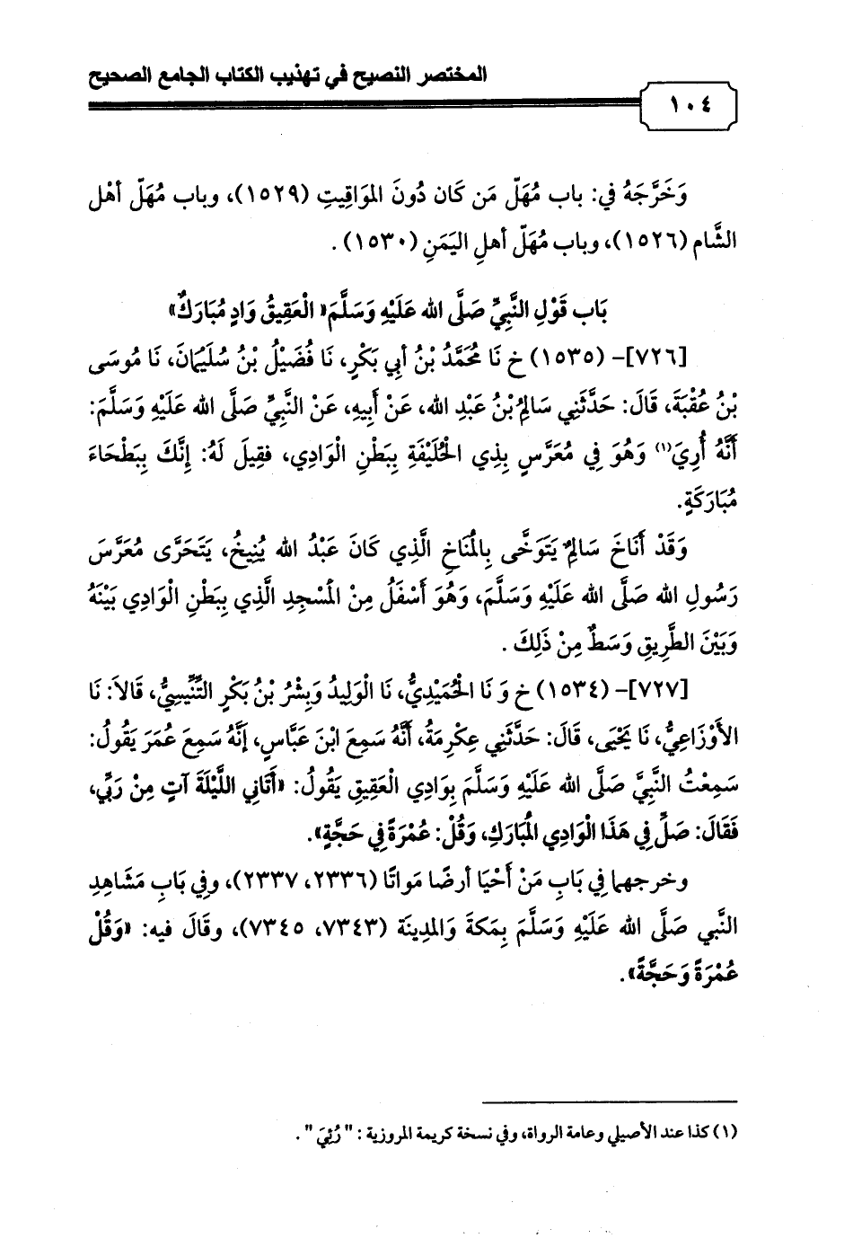 [726]- (1535) خ نَا مُحَمَّدُ بْنُ أبِي بَكْرٍ، نَا فُضَيْلُ بْنُ سُلَيْمَانَ، نَا مُوسَى بْنُ عُقْبَةَ، قَالَ: حَدَّثَنِي سَالِمُ بْنُ عَبْدِ الله، عَنْ أَبِيهِ، عَنْ النَّبِيِّ صَلَّى الله عَلَيْهِ وَسَلَّمَ: أَنَّهُ أُرِيَ (¬1) وَهُوَ فِي مُعَرَّسٍ بِذِي الْحُلَيْفَةِ بِبَطْنِ الْوَادِي, فقِيلَ لَهُ: إِنَّكَ بِبَطْحَاءَ مُبَارَكَةٍ.