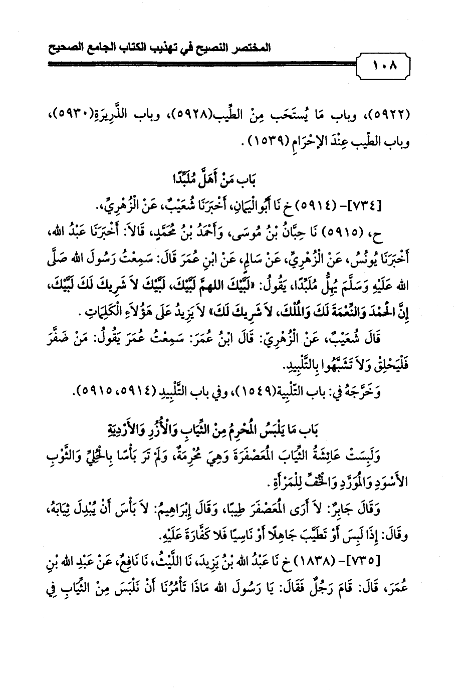 ح، (5915) نَا حِبَّانُ بْنُ مُوسَى، وَأَحْمَدُ بْنُ مُحَمَّدٍ، قَالاَ: أَخْبَرَنَا عَبْدُ الله، أَخْبَرَنَا يُونُسُ، عَنْ الْزُهْرِيِّ، عَنْ سَالِمٍ، عَنْ ابْنِ عُمَرَ قَالَ: سَمِعْتُ رَسُولَ الله صَلَّى الله عَلَيْهِ وَسَلَّمَ يُهِلُّ مُلَبِّدًا، يَقُولُ: «لَبَّيْكَ اللهمَّ لَبَّيْكَ, لَبَّيْكَ لاَ شَرِيكَ لَكَ لَبَّيْكَ, إِنَّ الْحَمْدَ وَالنِّعْمَةَ لَكَ وَالْمُلْكَ, لاَ شَرِيكَ لَكَ» لاَ يَزِيدُ عَلَى هَؤُلاَءِ الْكَلِمَاتِ.