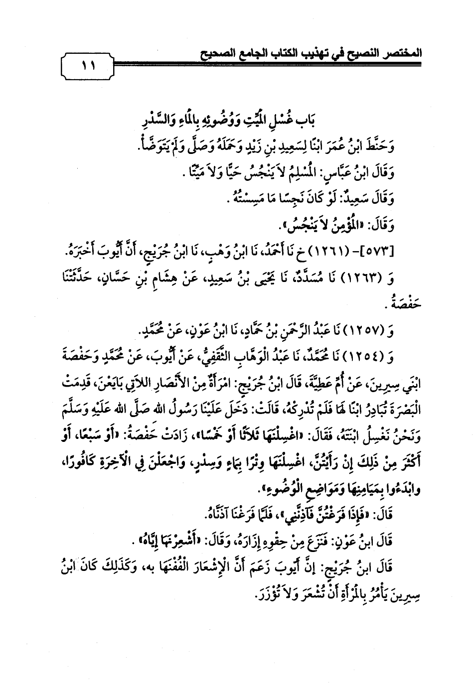 وَ (1254) نَا مُحَمَّدٌ، نَا عَبْدُ الْوَهَّابِ الثَّقَفِيُّ، عَنْ أَيُّوبَ، عَنْ مُحَمَّدٍ وَحَفْصَةَ ابْنَي سِيرِينَ، عَنْ أُمِّ عَطِيَّةَ، قَالَ ابْنُ جُرَيْجٍ: امْرَأَةٌ مِنْ الأَنْصَارِ اللاَتِي بَايَعْنَ، قَدِمَتْ الْبَصْرَةَ تُبَادِرُ ابْنًا لَهَا فَلَمْ تُدْرِكْهُ، قَالَتْ: دَخَلَ عَلَيْنَا رَسُولُ اللهِ صَلَّى الله عَلَيْهِ وَسَلَّمَ وَنَحْنُ نَغْسِلُ ابْنَتَهُ، فَقَالَ: «اغْسِلْنَهَا ثَلاَثًا أَوْ خَمْسًا»، زَادَتْ حَفْصَةُ: «أَوْ سَبْعًا, أَوْ أَكْثَرَ مِنْ ذَلِكَ إِنْ رَأَيْتُنَّ، اغْسِلْنَهَا وِتْرًا بِمَاءٍ وَسِدْرٍ، وَاجْعَلْنَ فِي الْآخِرَةِ كَافُورًا, وابْدَءُوا بِمَيَامِنِهَا وَمَوَاضِعِ الْوُضُوءِ».