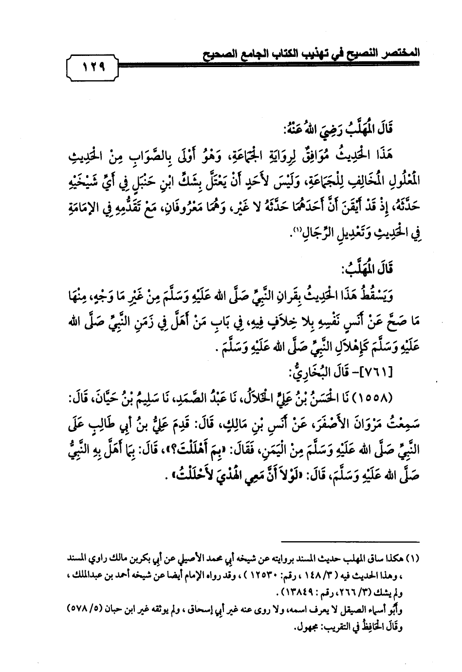 (¬1) هكذا ساق المهلب حديث المسند بروايته عن شيخه أبِي محمد الأصيلي عن أبِي بكربن مالك راوي المسند، وهذا الحديث فيه (3/ 148، رقم: 12530)، وقد رواه الإمام أيضا عن شيخه أحمد بن عبد الملك، ولم يشك (3/ 266، رقم: 13849).