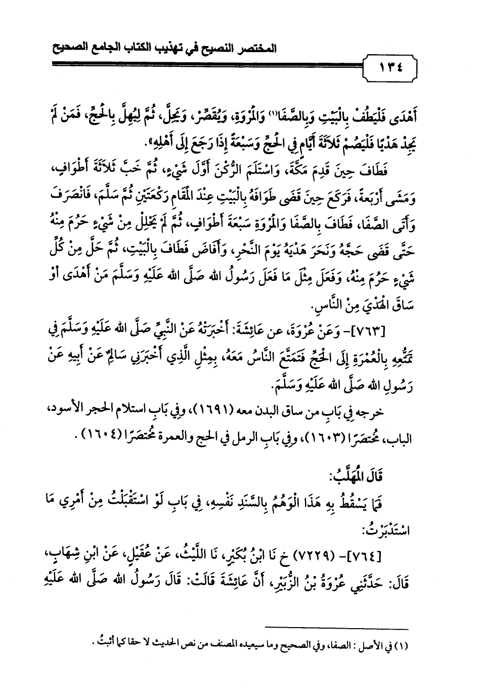 [763]- وَعَنْ عُرْوَةَ، عن عَائِشَةَ: أَخْبَرَتْهُ عَنْ النَّبِيِّ صَلَّى الله عَلَيْهِ وَسَلَّمَ فِي تَمَتُّعِهِ بِالْعُمْرَةِ إِلَى الْحَجِّ فَتَمَتَّعَ النَّاسُ مَعَهُ, بِمِثْلِ الَّذِي أَخْبَرَنِي سَالِمٌ عَنْ أَبِيهِ عَنْ رَسُولِ الله صَلَّى الله عَلَيْهِ وَسَلَّمَ.