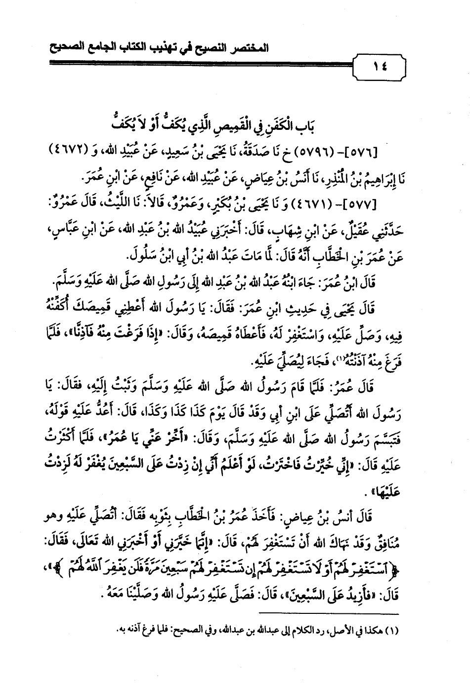 قَالَ أنسُ بْنُ عِياضٍ: فَأَخَذَ عُمَرُ بْنُ الْخَطَّابِ بِثَوْبِه فَقَالَ: أتُصَلِّي عَلَيْهِ وهو مُنَافِقٌ وَقَدْ نَهَاكَ الله أَنْ تَسْتَغْفِرَ لَهُمْ، قَالَ: «إِنَّمَا خَيَّرَنِي أَوْ أَخْبَرَنِي الله تَعَالَى، فَقَالَ: {اسْتَغْفِرْ لَهُمْ أَوْ لَا تَسْتَغْفِرْ لَهُمْ إِنْ تَسْتَغْفِرْ لَهُمْ سَبْعِينَ مَرَّةً فَلَنْ يَغْفِرَ اللَّهُ لَهُمْ}»، قَالَ: «فأَزِيدُ عَلَى السَّبْعِينَ»، قَالَ: فَصَلَّى عَلَيْهِ رَسُولُ الله وَصَلَّيْنَا مَعَهُ.