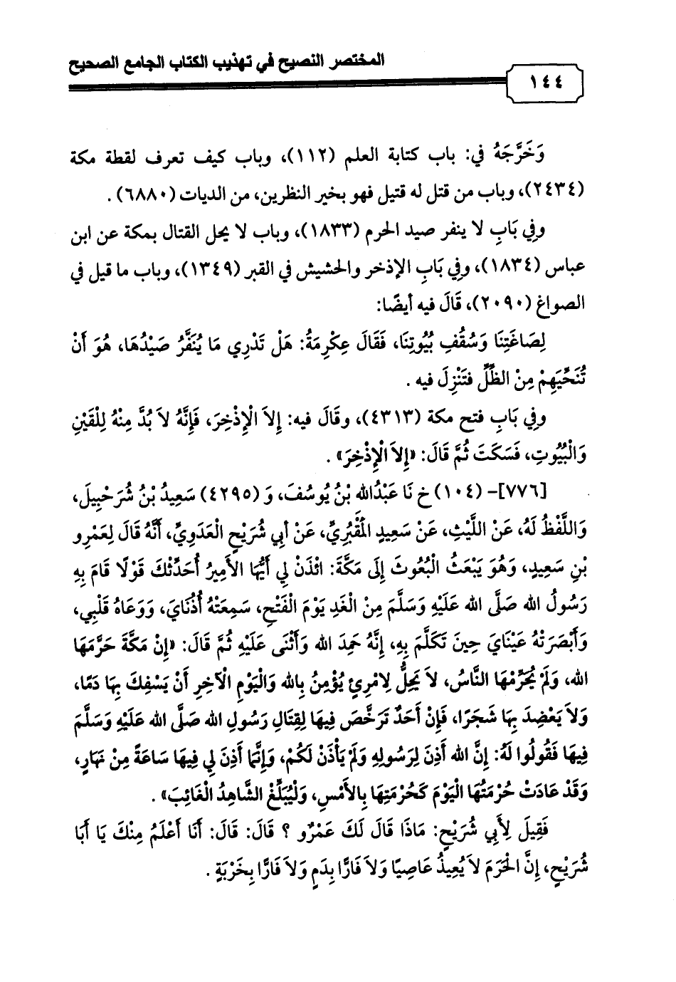 وفِي بَابِ لا ينفر صيد الحرم (1833)، وباب لا يحل القتال بمكة عن ابن عباس (1834) , وفِي بَابِ الإذخر والحشيش في القبر (1349) , وباب ما قيل في الصواغ (2090) , قَالَ فيه أيضًا: