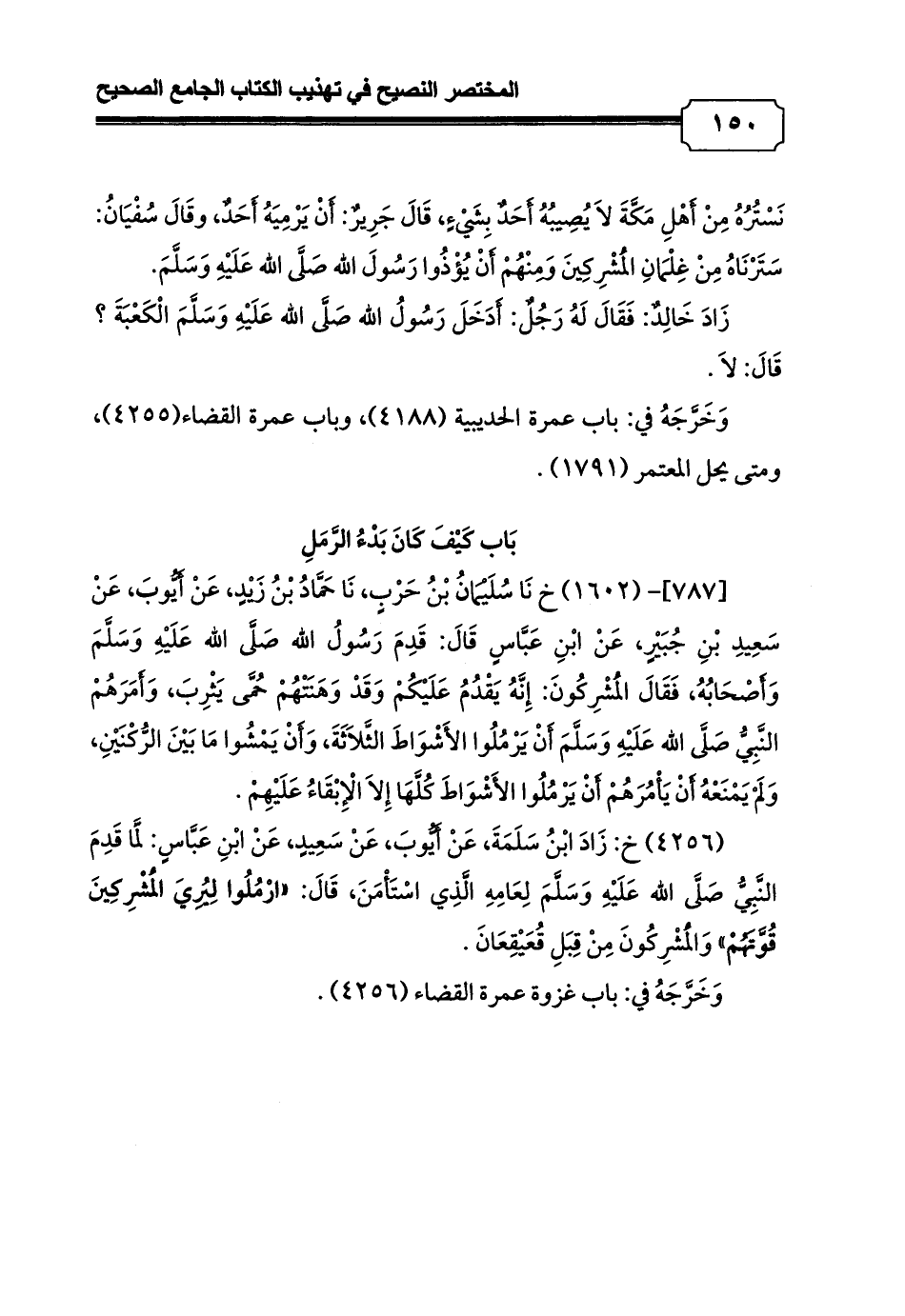 [787]- (1602) خ نَا سُلَيْمَانُ بْنُ حَرْبٍ، نَا حَمَّادُ بْنُ زَيْدٍ، عَنْ أَيُّوبَ، عَنْ سَعِيدِ بْنِ جُبَيْرٍ، عَنْ ابْنِ عَبَّاسٍ قَالَ: قَدِمَ رَسُولُ الله صَلَّى الله عَلَيْهِ وَسَلَّمَ وَأَصْحَابُهُ, فَقَالَ الْمُشْرِكُونَ: إِنَّهُ يَقْدُمُ عَلَيْكُمْ وَقَدْ وَهَنَتْهُمْ حُمَّى يَثْرِبَ، وَأَمَرَهُمْ النَّبِيُّ صَلَّى الله عَلَيْهِ وَسَلَّمَ أَنْ يَرْمُلُوا الأَشْوَاطَ الثَّلاَثَةَ, وَأَنْ يَمْشُوا مَا بَيْنَ الرُّكْنَيْنِ, وَلَمْ يَمْنَعْهُ أَنْ يَأْمُرَهُمْ أَنْ يَرْمُلُوا الأَشْوَاطَ كُلَّهَا إِلاَ الْإِبْقَاءُ عَلَيْهِمْ.