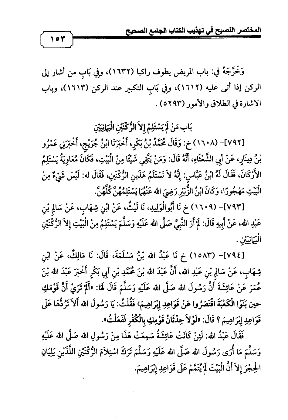 [793]- (1609) خ نَا أَبُوالْوَلِيدِ، نَا لَيْثٌ، عَنْ ابْنِ شِهَابٍ، عَنْ سَالِمِ بْنِ عَبْدِ الله، عَنْ أَبِيهِ قَالَ: لَمْ أَرَ النَّبِيَّ صَلَّى الله عَلَيْهِ وَسَلَّمَ يَسْتَلِمُ مِنْ الْبَيْتِ إِلاَ الرُّكْنَيْنِ الْيَمَانِيَيْنِ.