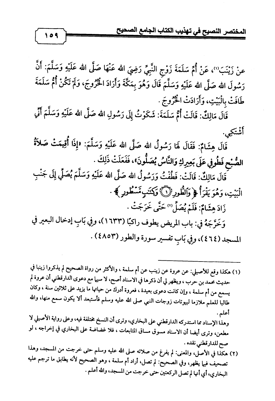 عنْ زَيْنَبَ (¬1)، عَنْ أُمِّ سَلَمَةَ زَوْجِ النَّبِيِّ رَضِيَ الله عَنْهَا صَلَّى الله عَلَيْهِ وَسَلَّمَ: أَنَّ رَسُولَ الله صَلَّى الله عَلَيْهِ وَسَلَّمَ قَالَ وَهُوَ بِمَكَّةَ وَأَرَادَ الْخُرُوجَ, وَلَمْ تَكُنْ أُمُّ سَلَمَةَ طَافَتْ بِالْبَيْتِ, وَأَرَادَتْ الْخُرُوجَ.